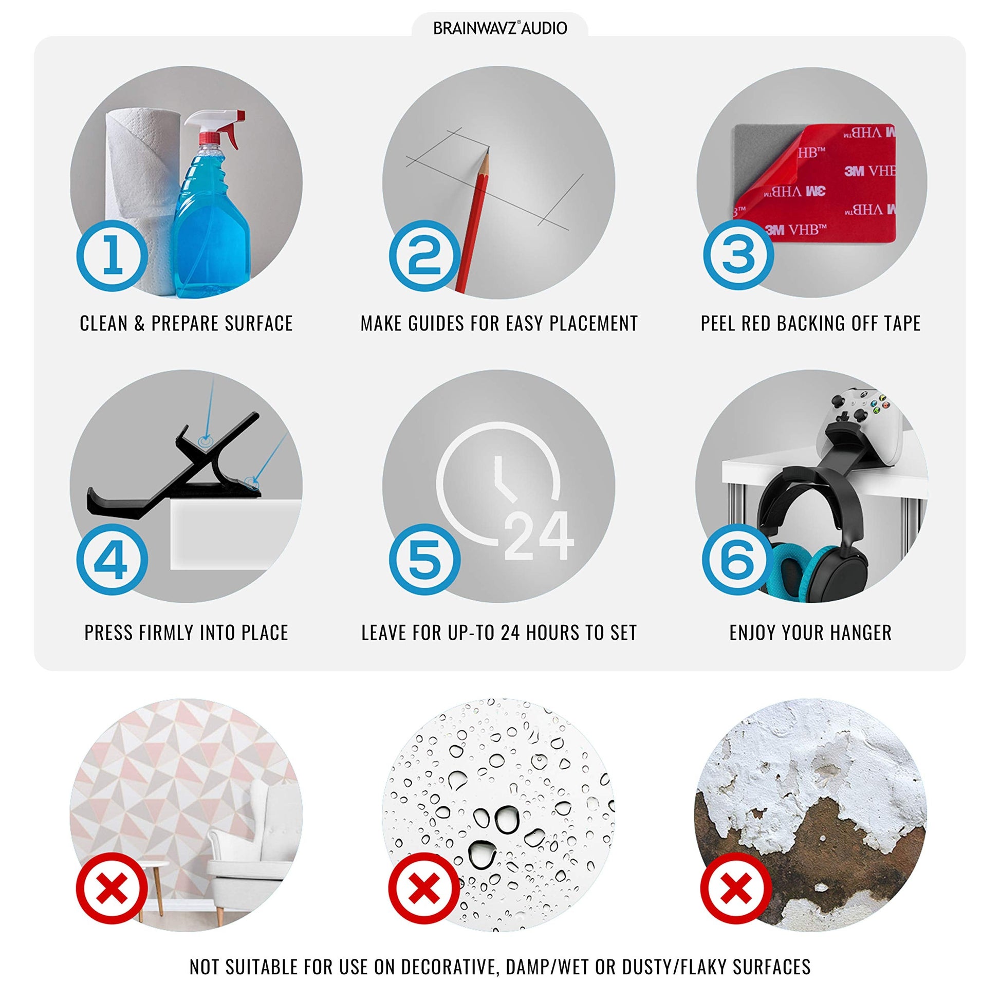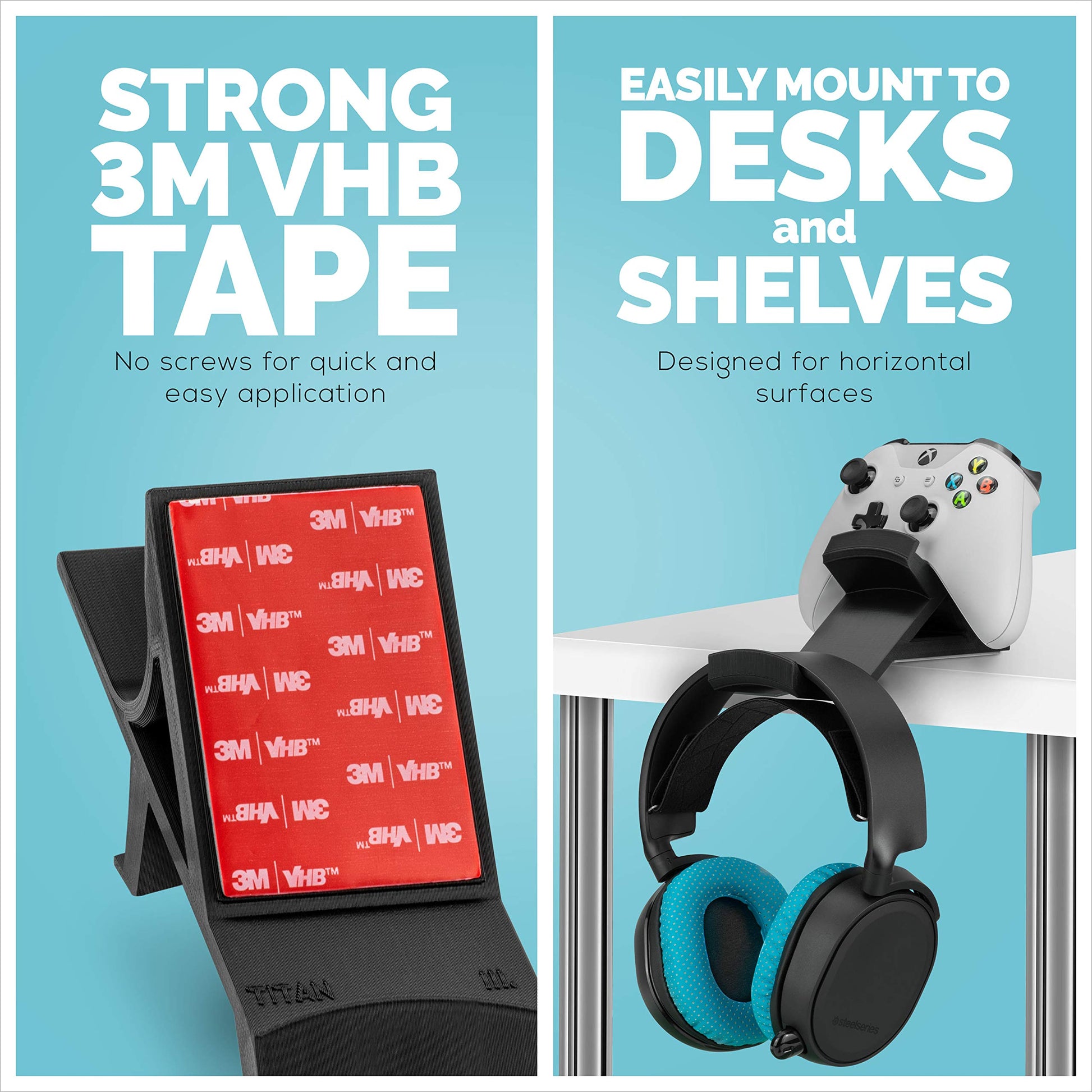 • SECURE INSTALLATION: Our Universal Desktop Game Controller & Headphone hanger tabletop mount comes with 3M VHBTM tape pre-fitted and can be installed almost on any flat table/desk top anywhere. GoPro trusts VHB to secure their cameras during extreme activities, so you can be assured it won’t let you, or your controllers down. Max Weight Limit: 1.5kg / 3.3lbs.