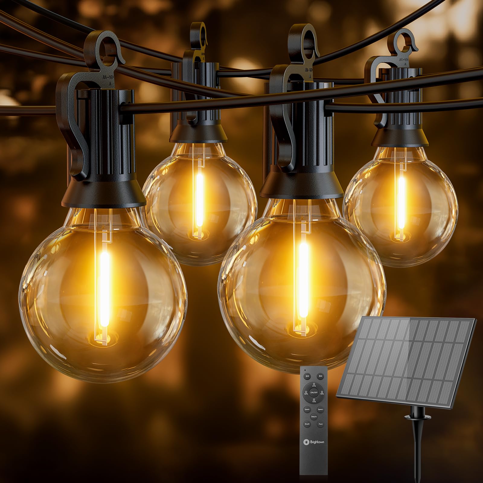 Brightown 108FT Solar String Lights Outdoor with Remote and 52 LED Shatterproof Bulbs, Dimmable & Timable, 3 Light Modes, Solar Patio String Lights Outdoor for Cafe, Garden, Deck, Outside Wedding