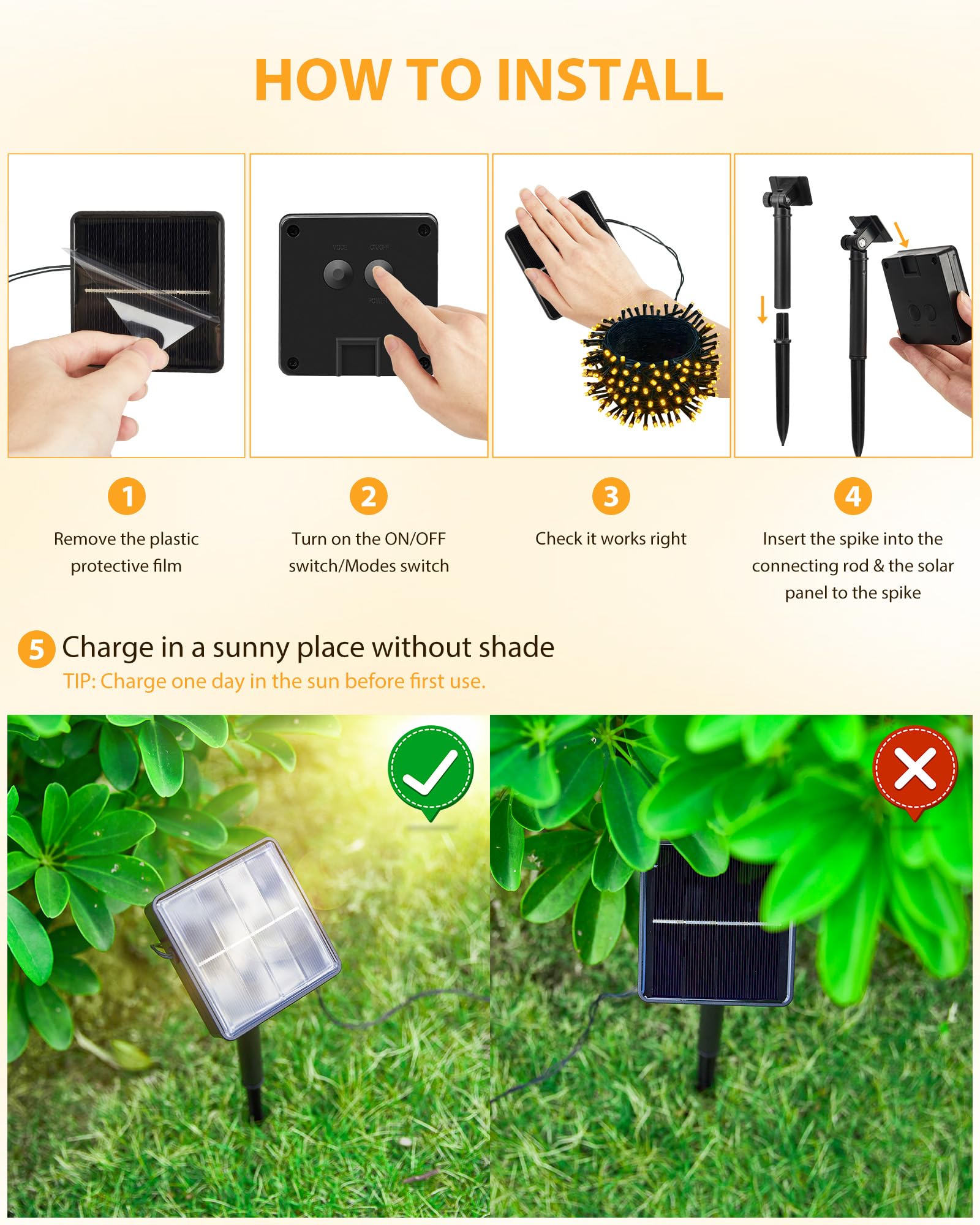 • 【Auto On/Off & Easy Installation】Solar outdoor lights fully charged under direct sunlight for 4-6 hours, they can work up to 8-10 hours at night, the outdoor solar lights automatically turn on at dusk and auto off at dawn. Also, solar outdoor string lights with ground stake is easy to install, just stake into the ground, and our string lights have soft light cords, very suitable for DIY any shape.