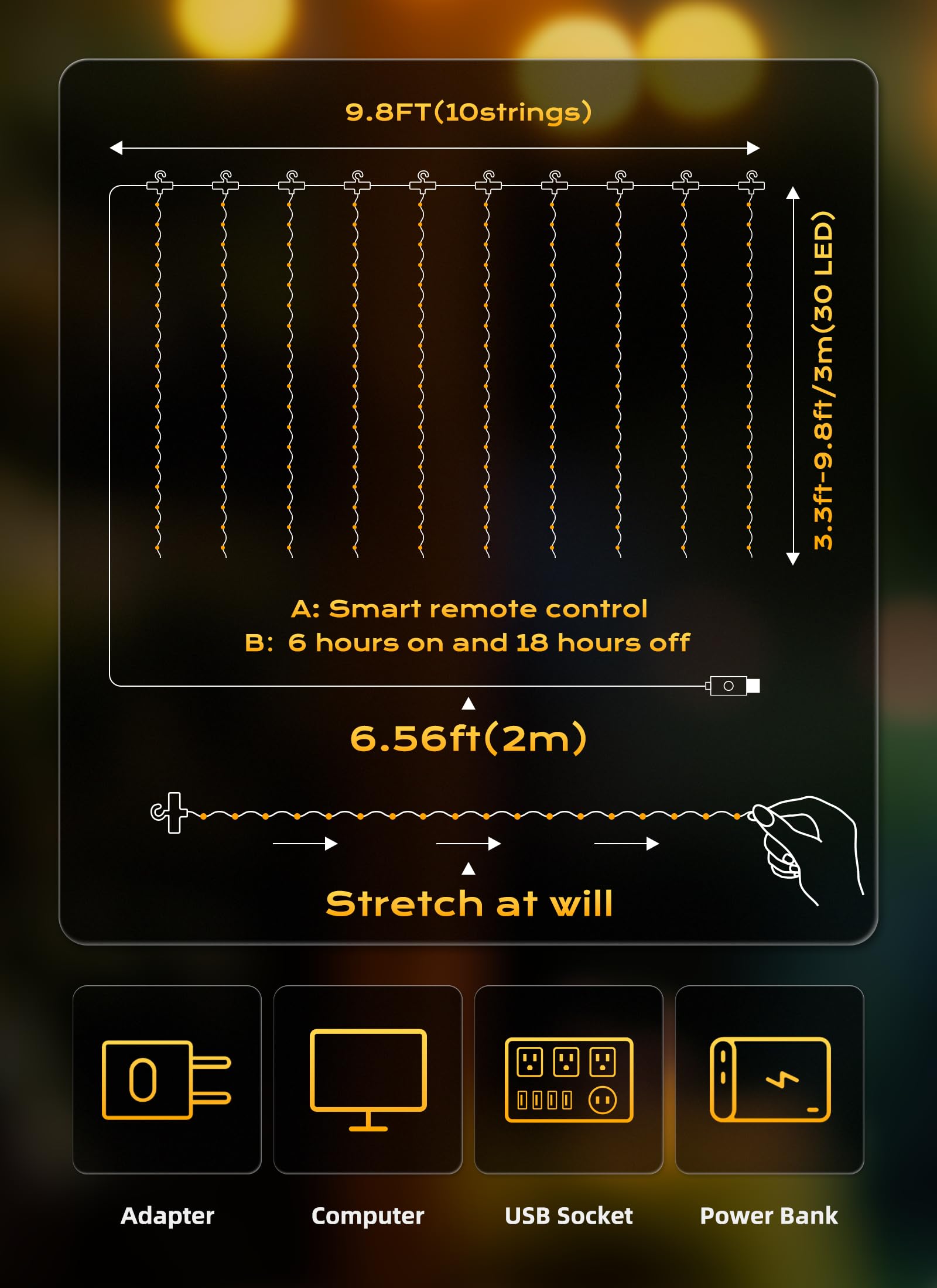 • [Timer & Remote] We can use the remote control to timing for 6 hours on and 18 hours off. What's more, the brightness of our curtain lights is adjustable of 20% 40% 60% 80% 100%
