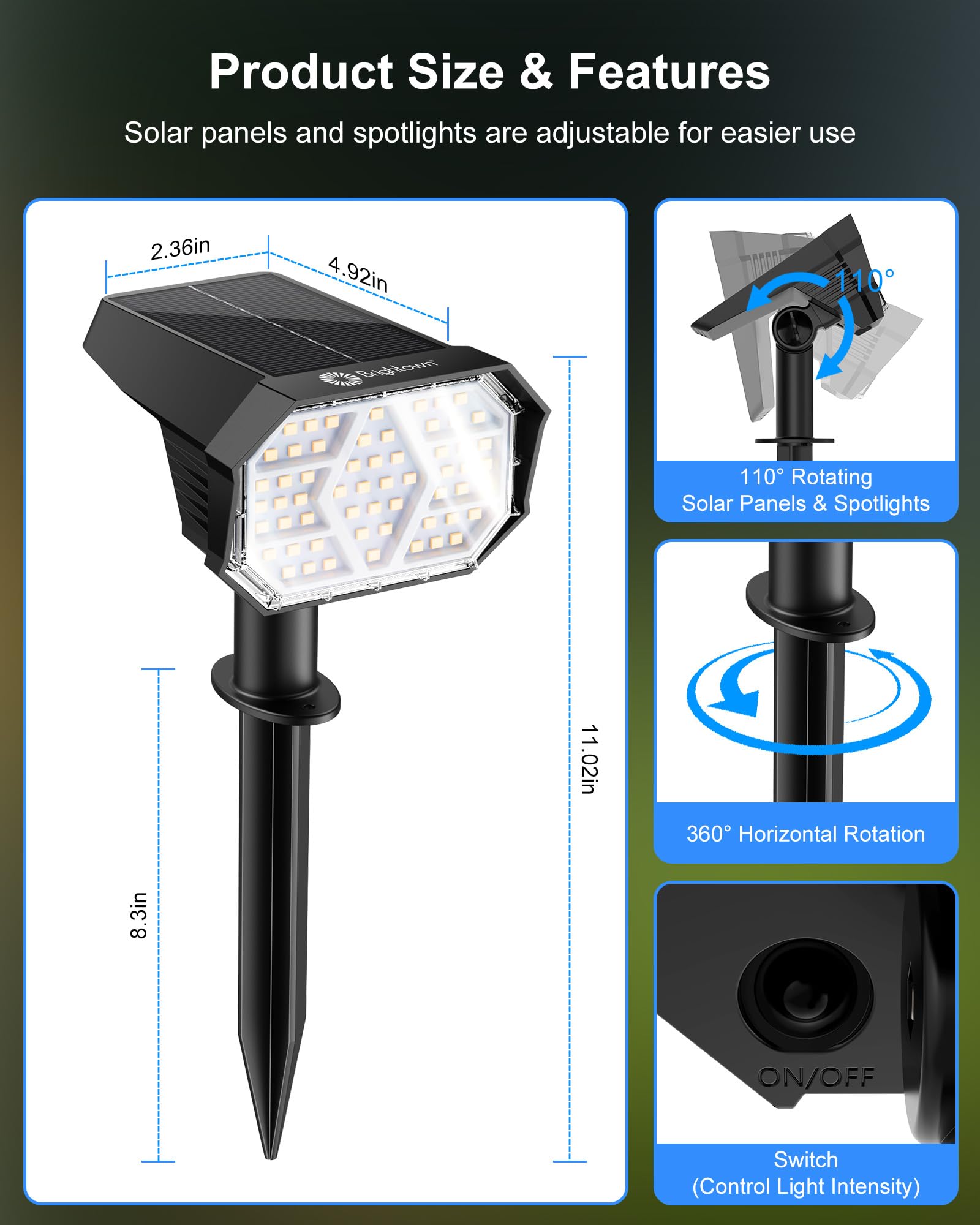 • ใ€๐Ÿ-๐ข๐ง-๐Ÿ ๐ฅ๐š๐ง๐๐ฌ๐œ๐š๐ฉ๐ž ๐ฅ๐ข๐ ๐ก๐ญใ€‘Solar spotlights outdoor waterproof are versatile and can be used as ground lights and wall lights. Simply insert the ground lights into the lawn for landscape lighting, or use the included screws to mount it on the wall, perfect for lighting up gardens, patios, driveways, pathways, fences, pools, lawns and more.Solar landscape lights create a warm and safe atmosphere while beautifying landscapes, trees, plants and flower beds.