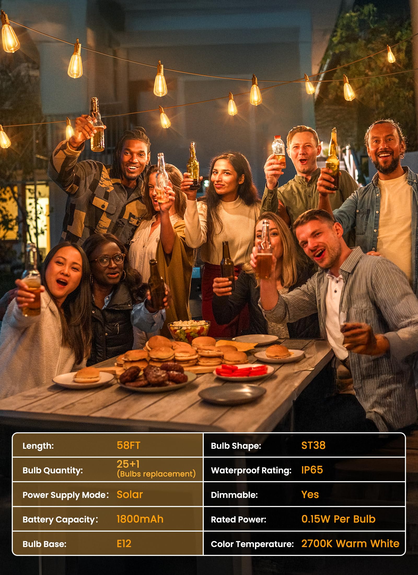 Brightown Outdoor Solar String Lights Waterproof 58FT with 25 Shatterproof ST38 LED Bulbs, 2700K Solar Lights Outdoor with Remote, Solar String Lights for Outside, Camping, Yard, Party Decor
