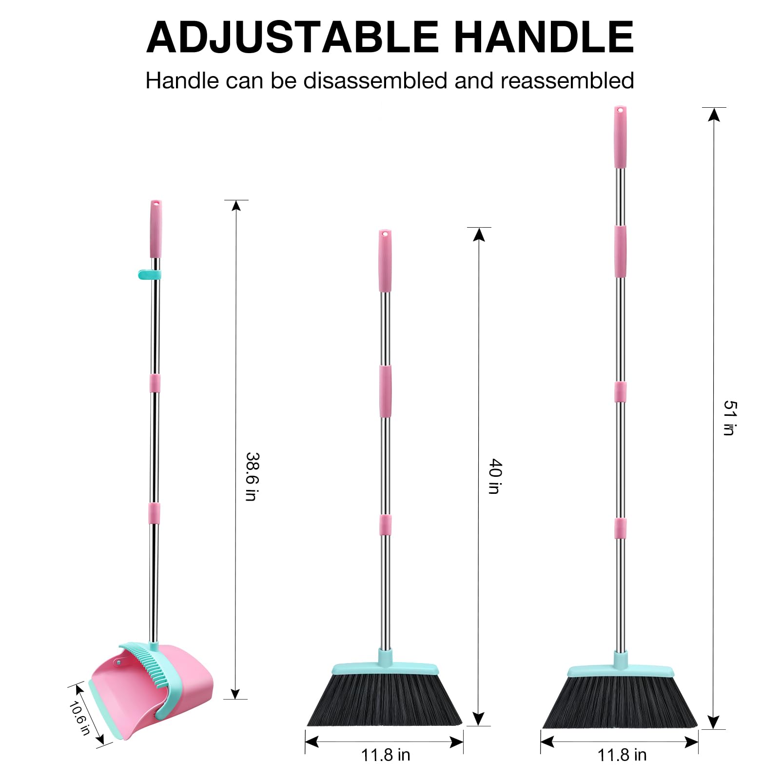 Broom and Dustpan Set, 52-in Long Adjustable Handle Broom Dustpan Combo with Dust pan Teeth to Automatically Clean Hair Suitable for Home Kitchen Office Hall Floor (Pink&Blue), 2 Pack
