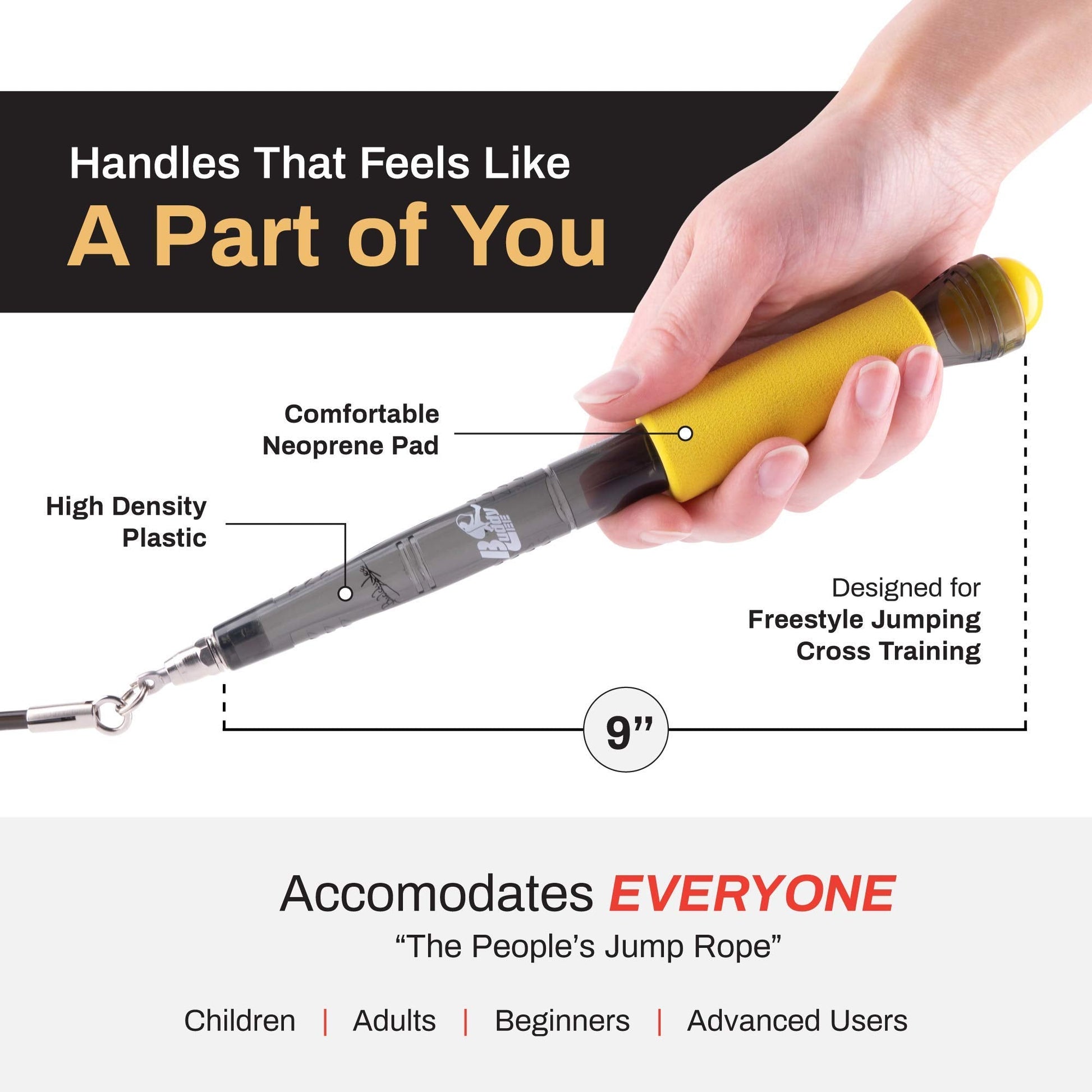 • HIGH-QUALITY MATERIAL: Our 9” handles are made of lightweight plastic for superior quality, durability, and looks. Ergonomically designed to fit comfortably in all hands. Super soft handle grips made of neoprene material gives you a soft, sturdy, and fatigue-free grip. Our 9'4' inches high-quality PVC cord is aero dynamic and perfectly weighted