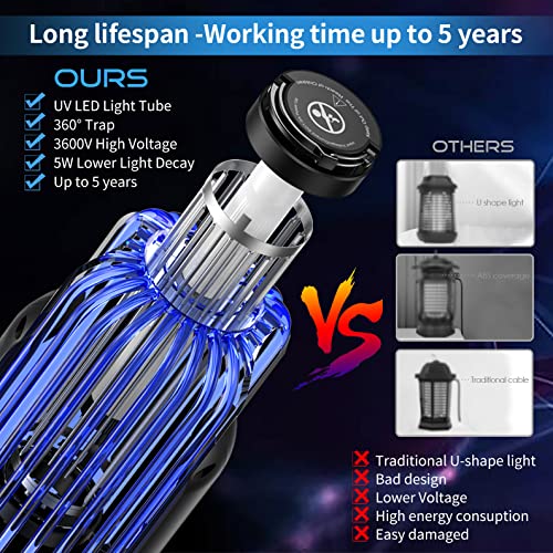 • [Unique Design, 3X Stronger Lure Mosquitoes]: This mosquito zapper use New UV LED light with no extra top coverage, greatly increased the bug zapper UV light emitting coverage, 365-395nm UV wavelength combined with external translucent blue light pipe, Highly improved the efficiency to lure mosquitoes, flies, wasps, moths, gnats, and other flying insects to fly in.