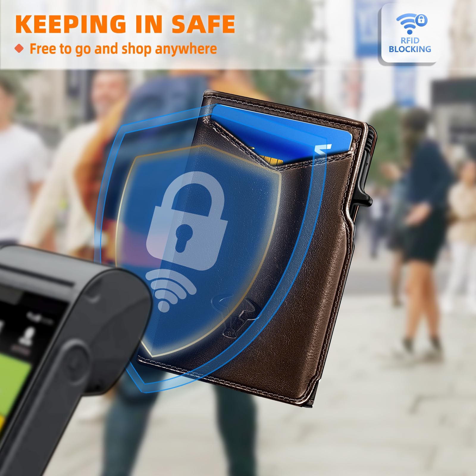 • CAPACITY-Slim wallet with refined layout to fit in front pocket,easy for 8 cards and couple of bills--5 cards in the aluminum case with pop-up access,3 cards in the leather shell;