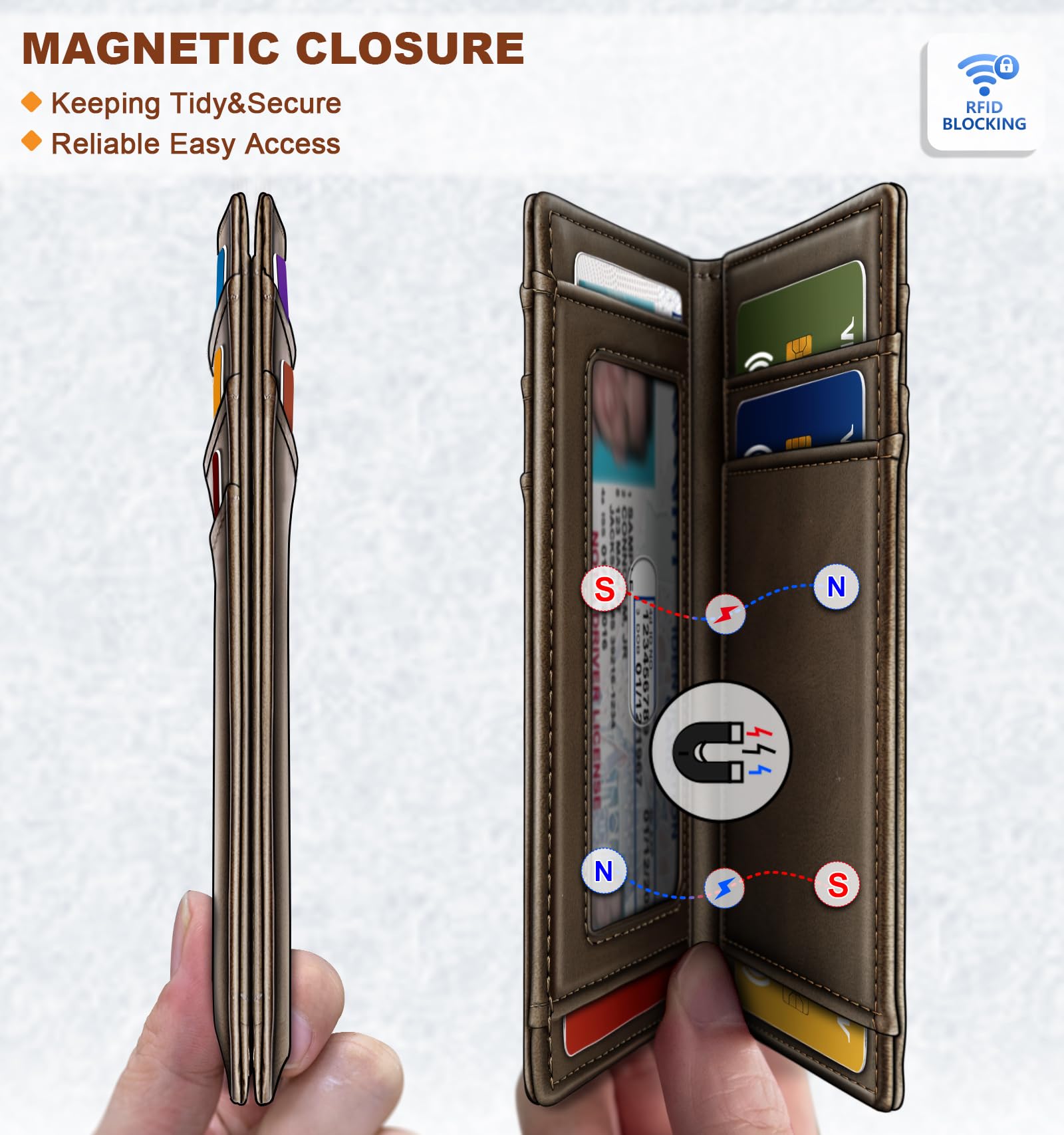 • MAGNETIC SECURITY--Reliable magnetic closure keeps your wallet securely shut, ensuring your cards and cash stay safe and tidy;