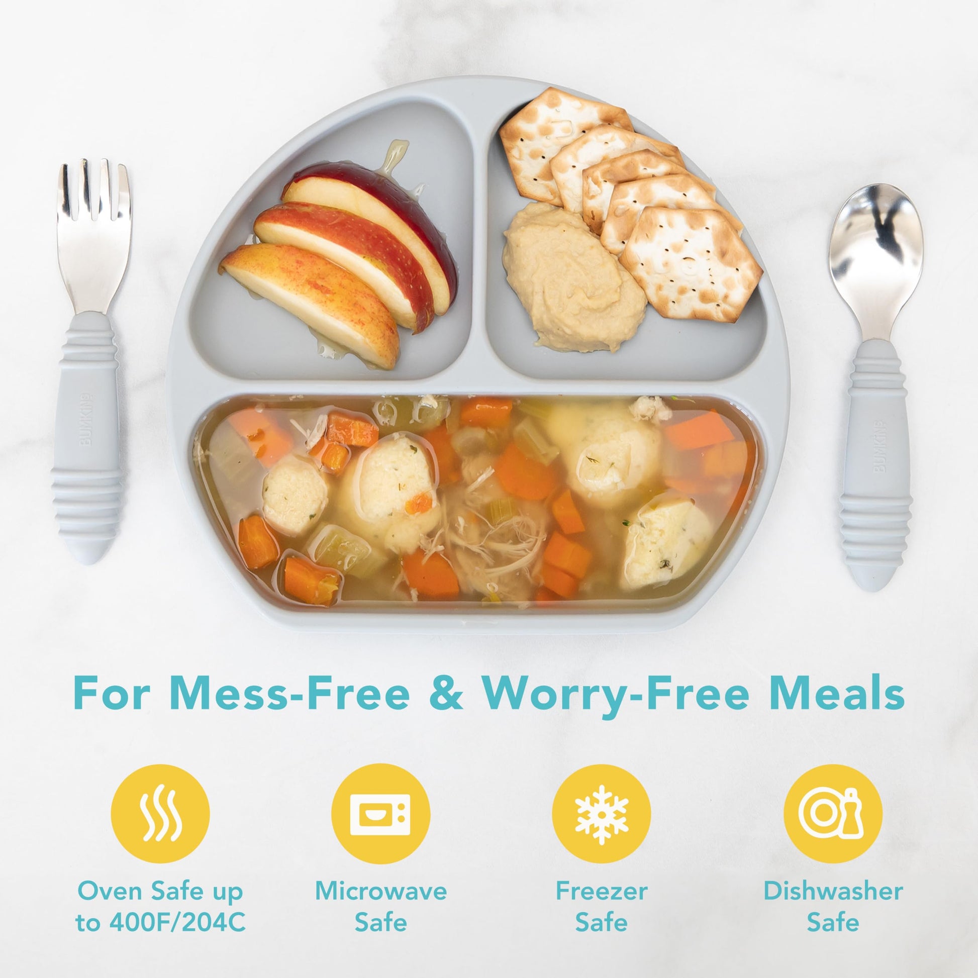 Bumkins Toddler and Baby Suction Plate, Divided Grip Dish for Babies and Kids, Baby Led Weaning, Feeding Supplies, Sticks to Tables and Highchairs, Platinum Silicone, for Chidren 6 Months, Gray