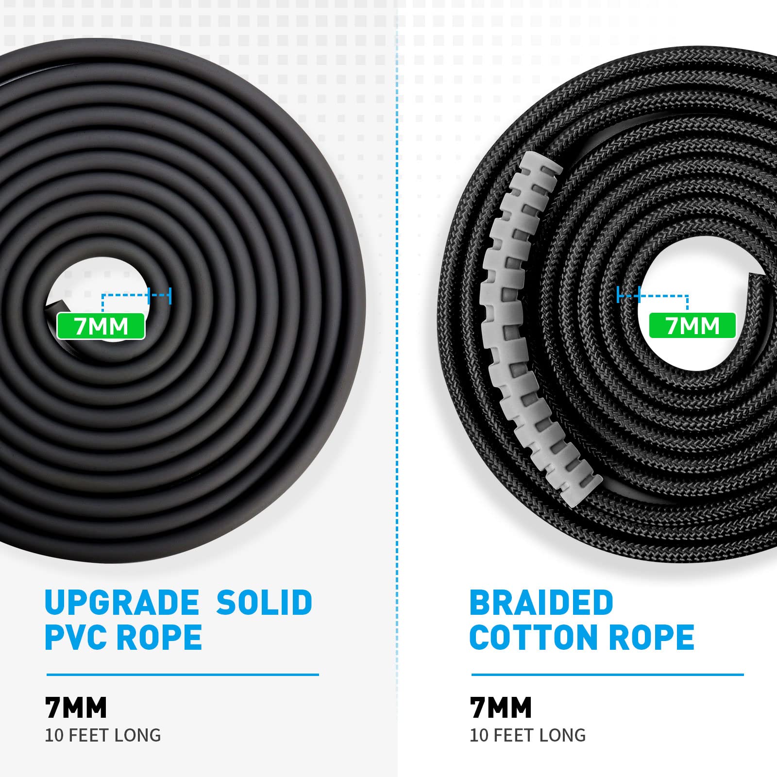 • We've added a wear-resistant silicone protective tube to our 7mm braided cotton rope, which weighs 0.2LB and is 10 feet long. And if you need a more wear-resistant option, our 7mm solid PVC rope weighs 0.28LB and is also 10 feet long. Both options require a perfect combination of speed and strength when using.