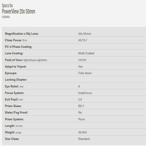 Details: Binocular, Magnification 12 x 50, Field of View 267 ft., Prism Type Porro, Length (In.) 3-1/2, Width (In.) 8-1/4, Height (In.) 8-1/4, Lens Coating Multi, Min. Distance (Ft.) 40, Tripod Mountable Yes, Weight 1.9 lb., Includes Neck Strap and Carrying Case
