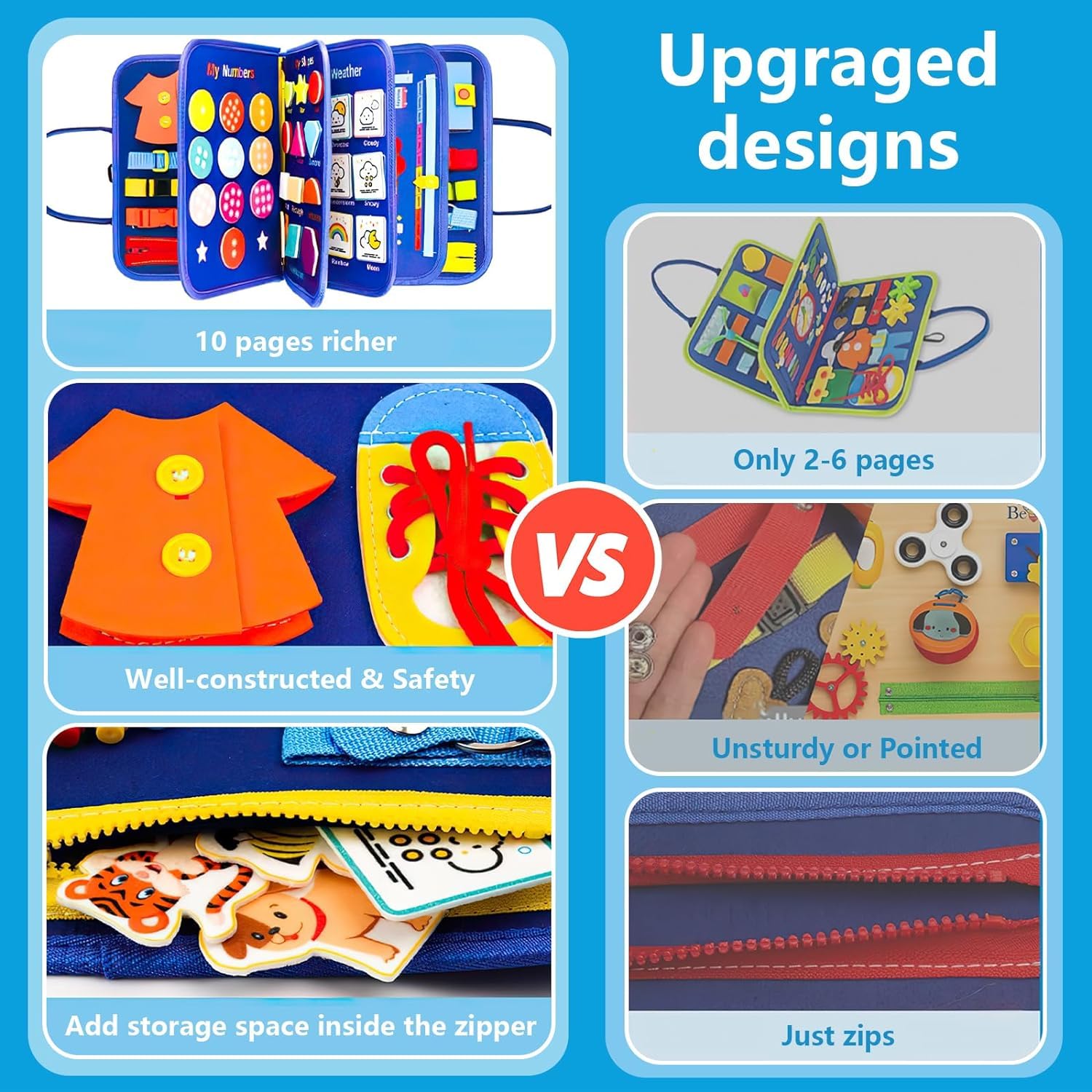 • 【LATEST BUSY BOARD】Newly upgrade to 12 pages, SaFeli innovative Montessori toys for ages 2-4 offers 12 pages toddler activities to keep your baby busy for hours. Includes 2 pages of fine motor skills such as buckles, zips, shoelaces, belts etc., 8 pages of preschool learning activities such as drawing, alphabet, shapes, colours etc., 2 pages of outer space elements to spark imagination. For storage, it's also equiped with a zip pocket to keep small items organised so they don't get lost.
