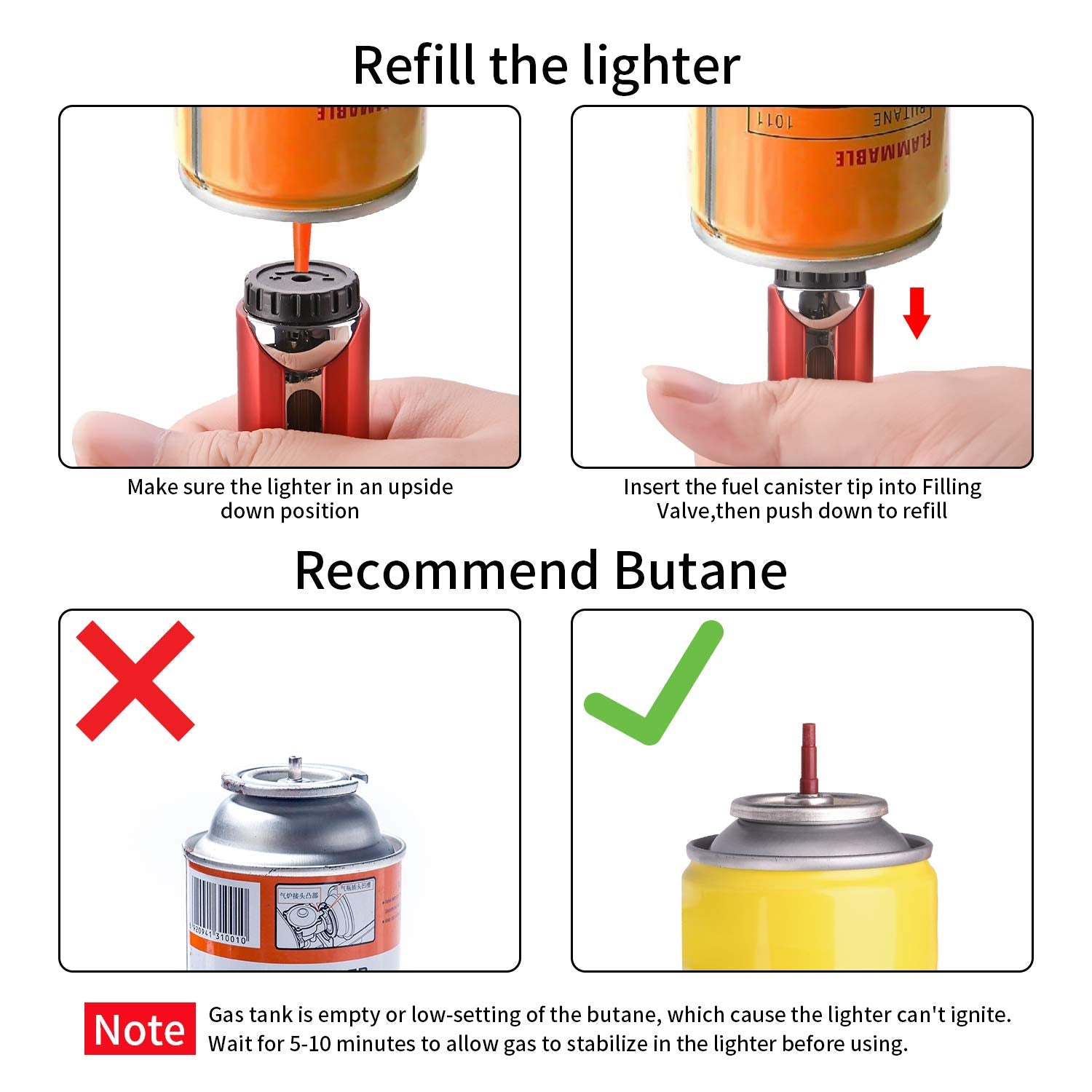 • [Refillable & Adjustable Flame]- The butane torch lighters is refillable and compatible with most butane gas refills. Fuel adjustment valve can control the flame height easily for various needs. The flame height is controlled at 1.5-2.0CM initially. 5ML of gas can use for 500-1000 ignitions normally. (Note:Gas is not prefilled in the lighter.)