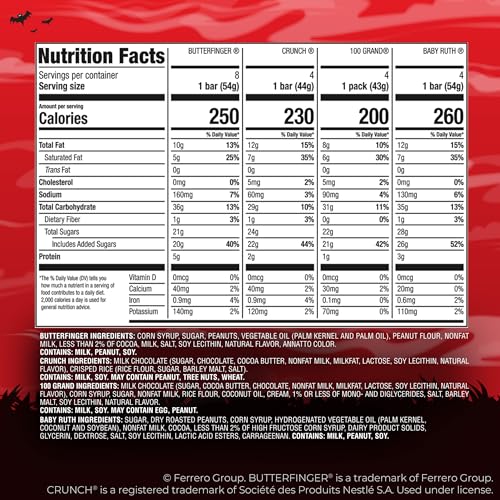 Details: Does the spooky season put you in the mood for something sweet, crunchy, chewy, chocolatey or peanut-buttery? Why not have it all? There’s no need to choose just one flavor with this assortment of Butterfinger, CRUNCH, Baby Ruth and 100 Grand candy bars. Enjoy a variety pack of four fan favorites in this 28-count box of full size assorted candy bars. Discover chocolatey bars that are perfectly classic and delicious—from the peanut-buttery kick of Butterfinger to the crispy bite of CRUNCH, the chewy goodness of caramel in 100 Grand and the irresistible blend of dry roasted peanut and nougat in each Baby Ruth bar. With no artificial flavors or colors, this satisfying snack is packed with shareable goodness. These full size candy bars are individually wrapped and all dressed up for Halloween to make the perfect treat to share with friends, family and coworkers any time of the year. Add these full size bars to your Halloween candy bowl and put a big smile on the face of every trick-or-treater who comes knocking on your door. Grab a box of assorted favorites today to bring your Halloween snacks game to the next level.