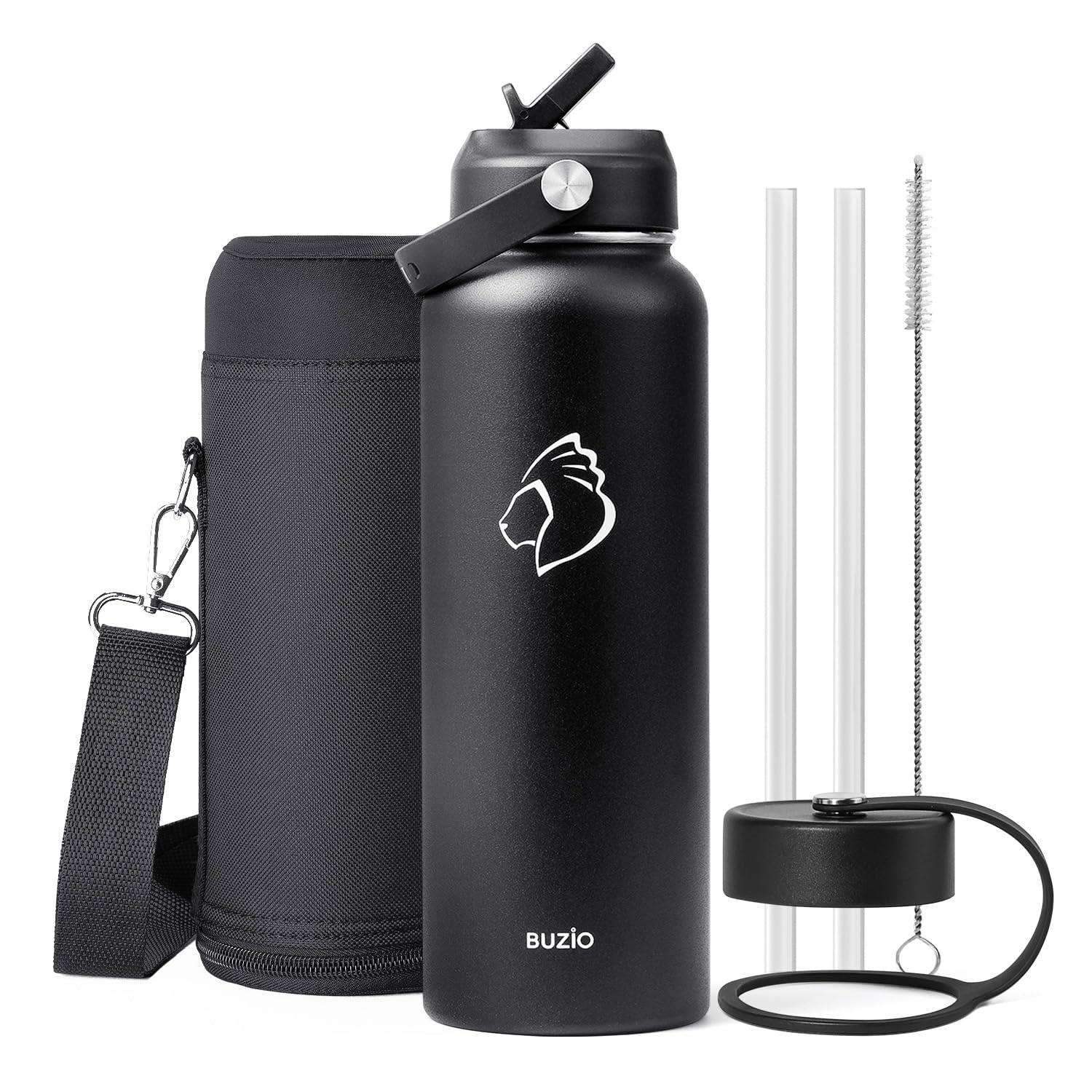BUZIO 1180ml Insulated Water Bottle with Straw Lid and Flex Cap, 40oz Stainless Steel Drinking Bottle (Keep Cold 48 Hrs/Hot 24 Hrs) Metal Flask Leakproof Wide Mouth Thermo Canteen for Sports, Black
