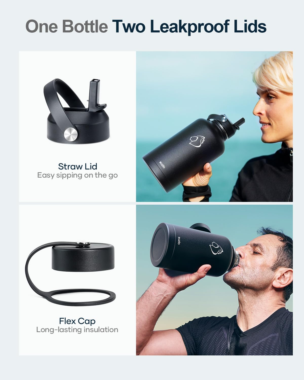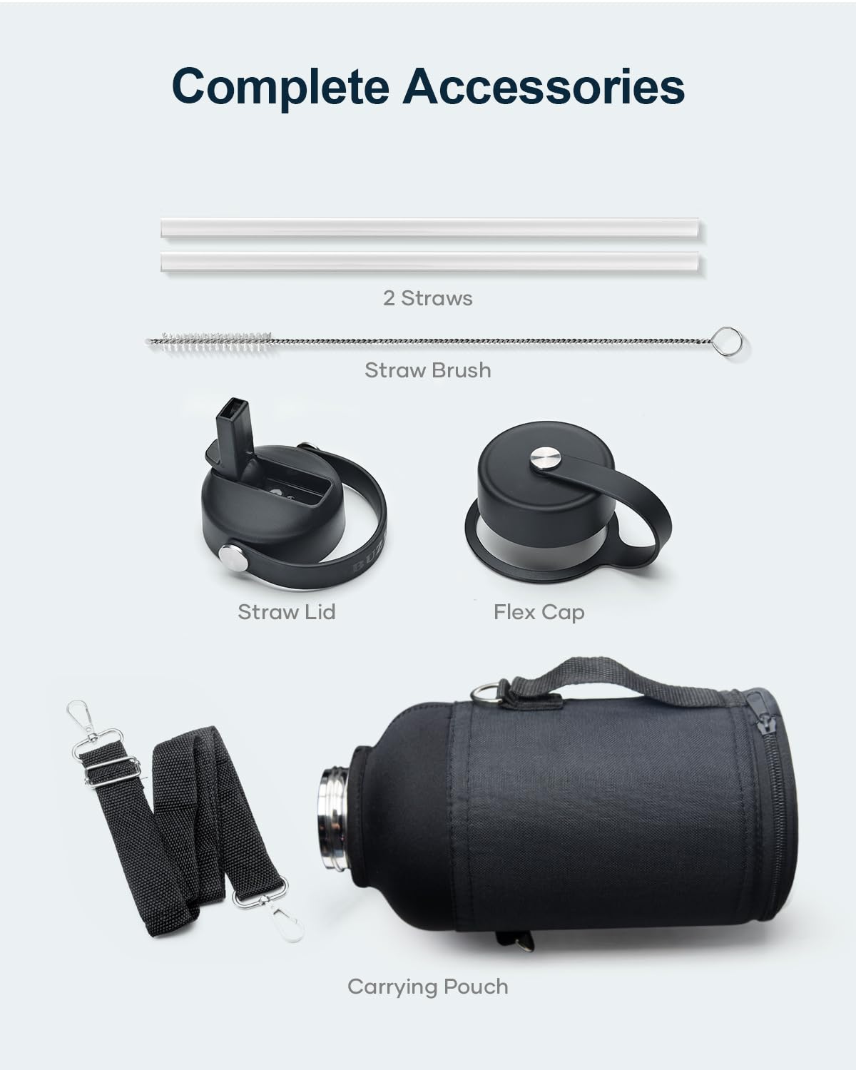 • What You Get: Buzio 64oz Water Bottle with carrying pouch, Straw Lid, Flex Lid, 2 x Straws, Bottle Brush, our worry-free lifetime warranty and friendly customer service