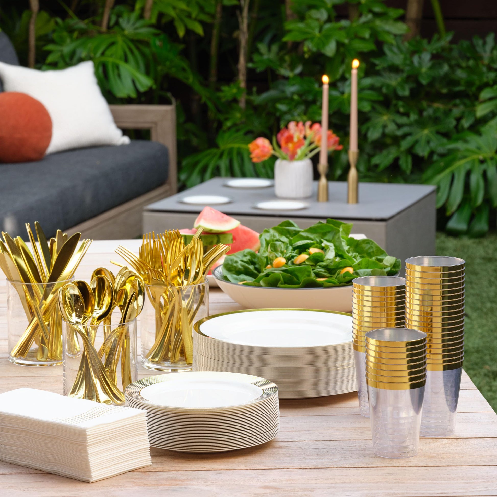• Elegant & Fancy Plawtic Dinnerware Sets – Includes everything you need to host 25 guests: 25 dinner plates (10.25”), 25 dessert plates (7.5”), 50 forks, 25 knives, 25 spoons, and 25 luxurious napkins with a linen feel and metallic foil stamped finish.