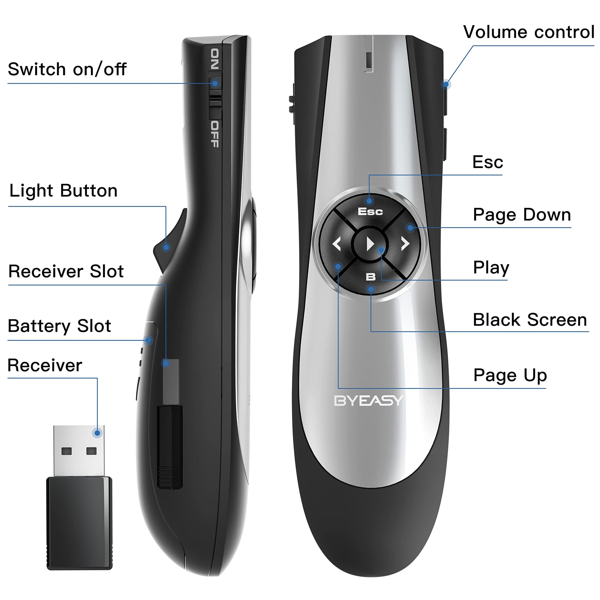 • What You Get:BYEASY Presentation Clicker, User Manual