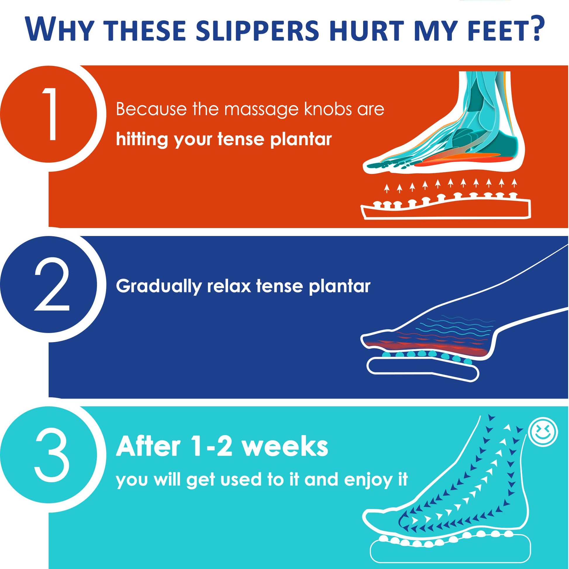 • ✔PAINFUL SANDALS: When you first start wearing these therapeutic massage slippers, you may experience a lot of pain. Because the massage knobs are stretching the tense plantar muscles. Please add socks and wear 3-5 minutes a time to start, it will take 1-2 weeks to get used to it gradually.