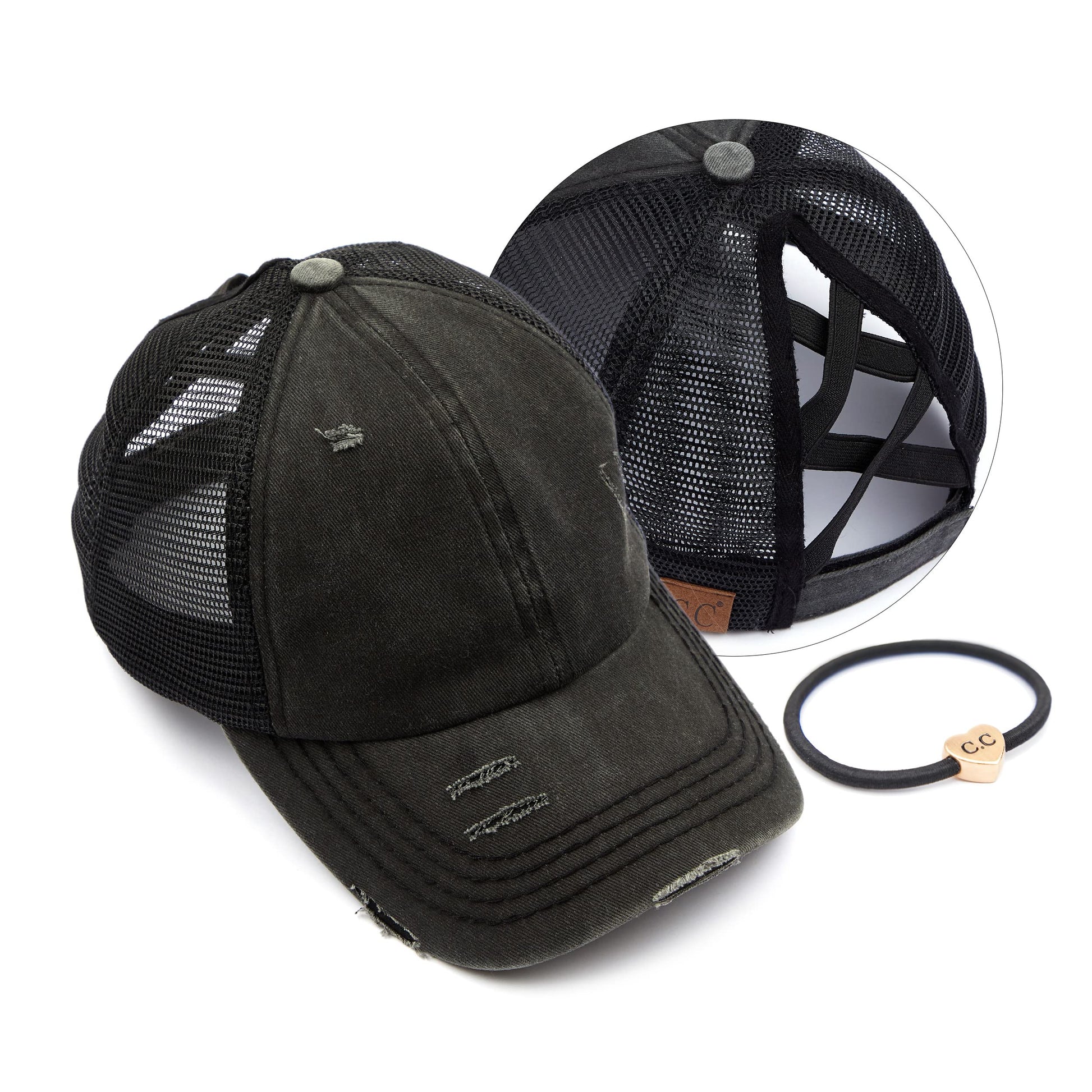 C.C Exclusives Washed Distressed Cotton Denim Criss-Cross Ponytail Hat Baseball Cap Bundle Hair Tie (BT-780) (Black)
