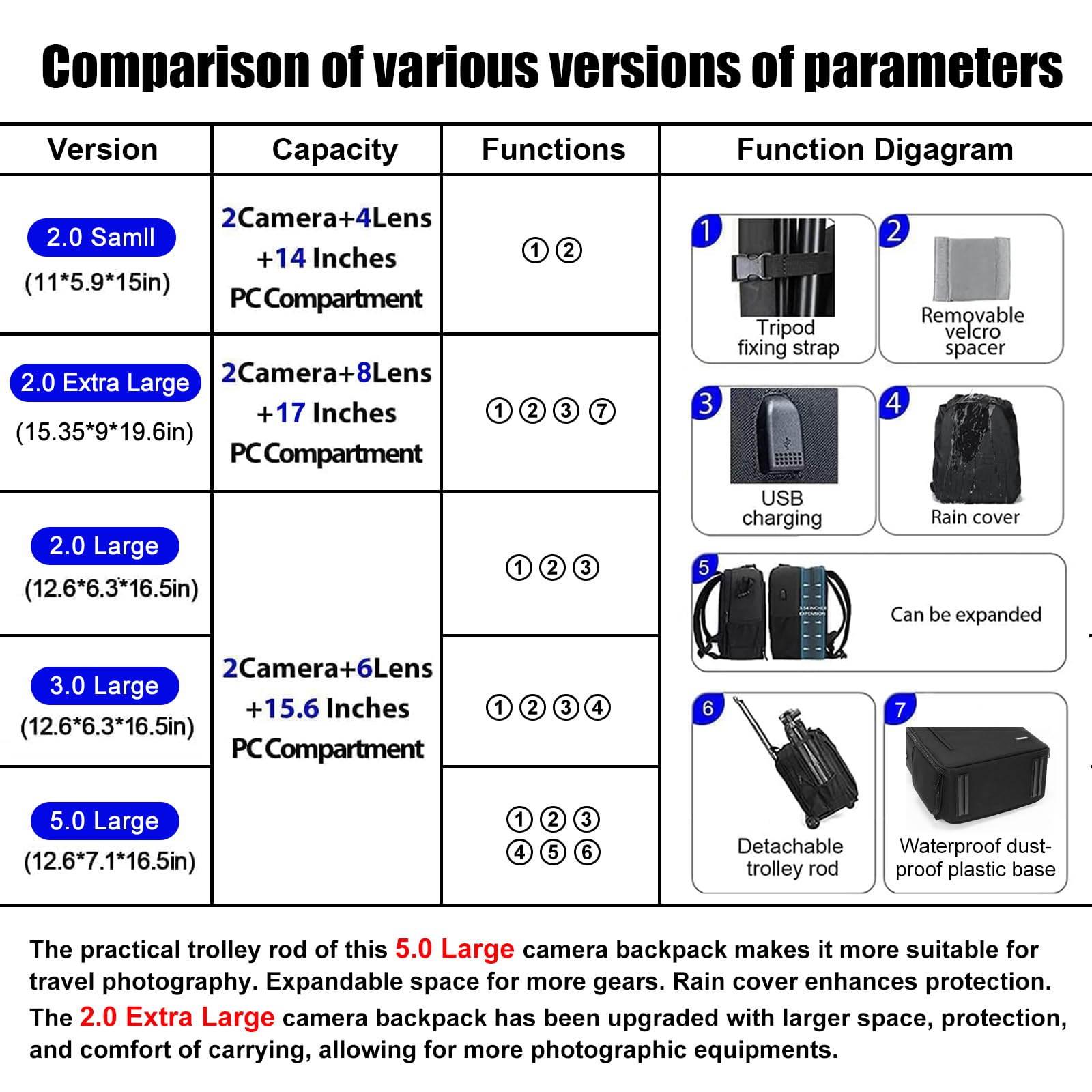 • 【Multi-Functions】⑥CADeN alloy zipper won't rusty within 3 years, and won't break within 5 years; ⑦One side for iPad storage with sticker fixed inside the camera bag; ⑧Inner bag paddings are made of 7-layer PE foam and PP board, protect your camera from shocking, very durable; ⑨Shoulder belts and handle that connected with camera rusksack have taken bar-tack reinforcement technology which load-bearing up to 50kg(110.2lb). Best care for your cameras, lens, flashes, tripod, and other accessories.