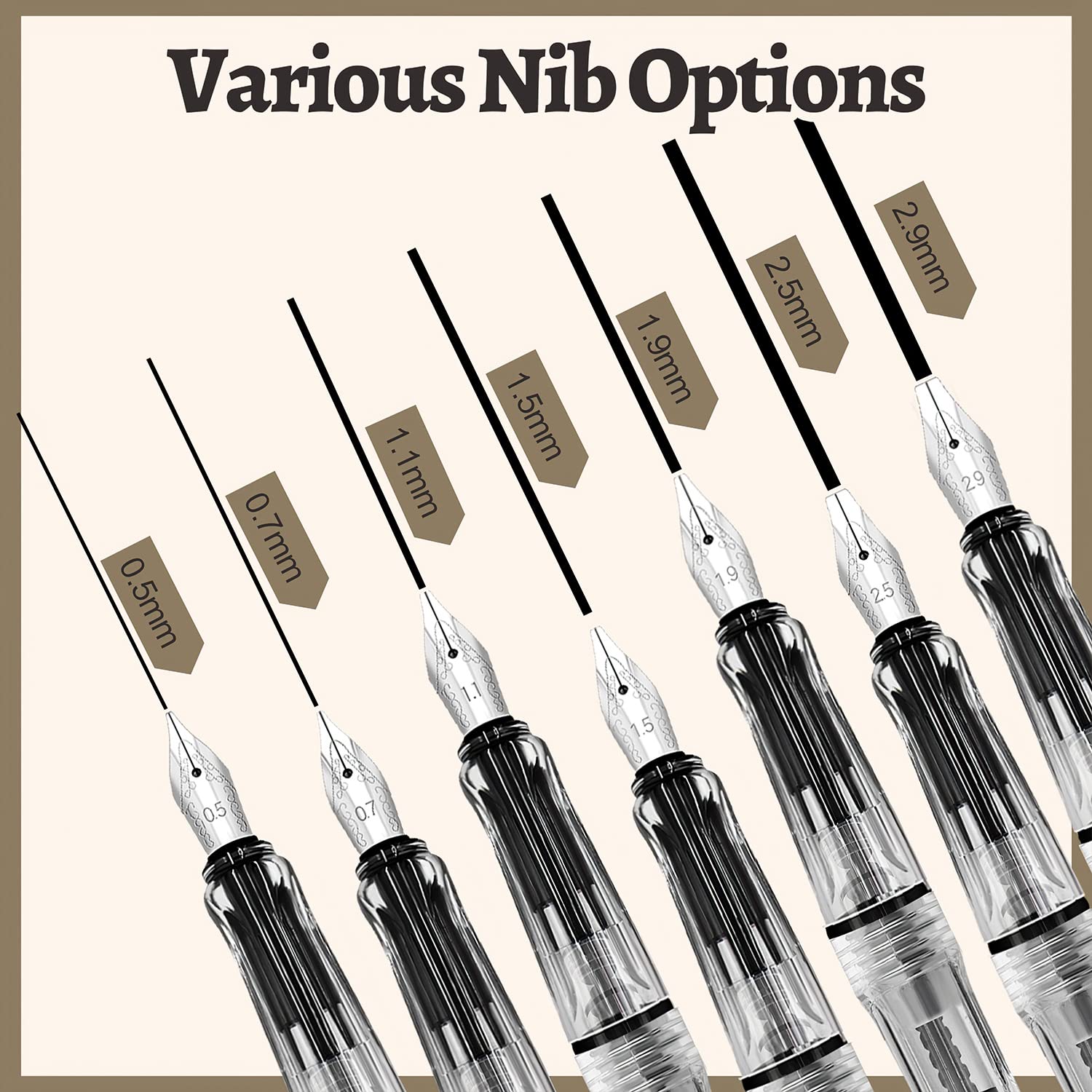 • Versatile Set: Calligraphy pen set contains 7 fountain pens with different nib widths (0.5 mm, 0.7 mm, 1.1 mm, 1.5 mm, 1.9 mm, 2.5 mm, 2.9 mm) and 40 ink cartridges in 11 colours, fit for various font styles and meets your writing and drawing needs