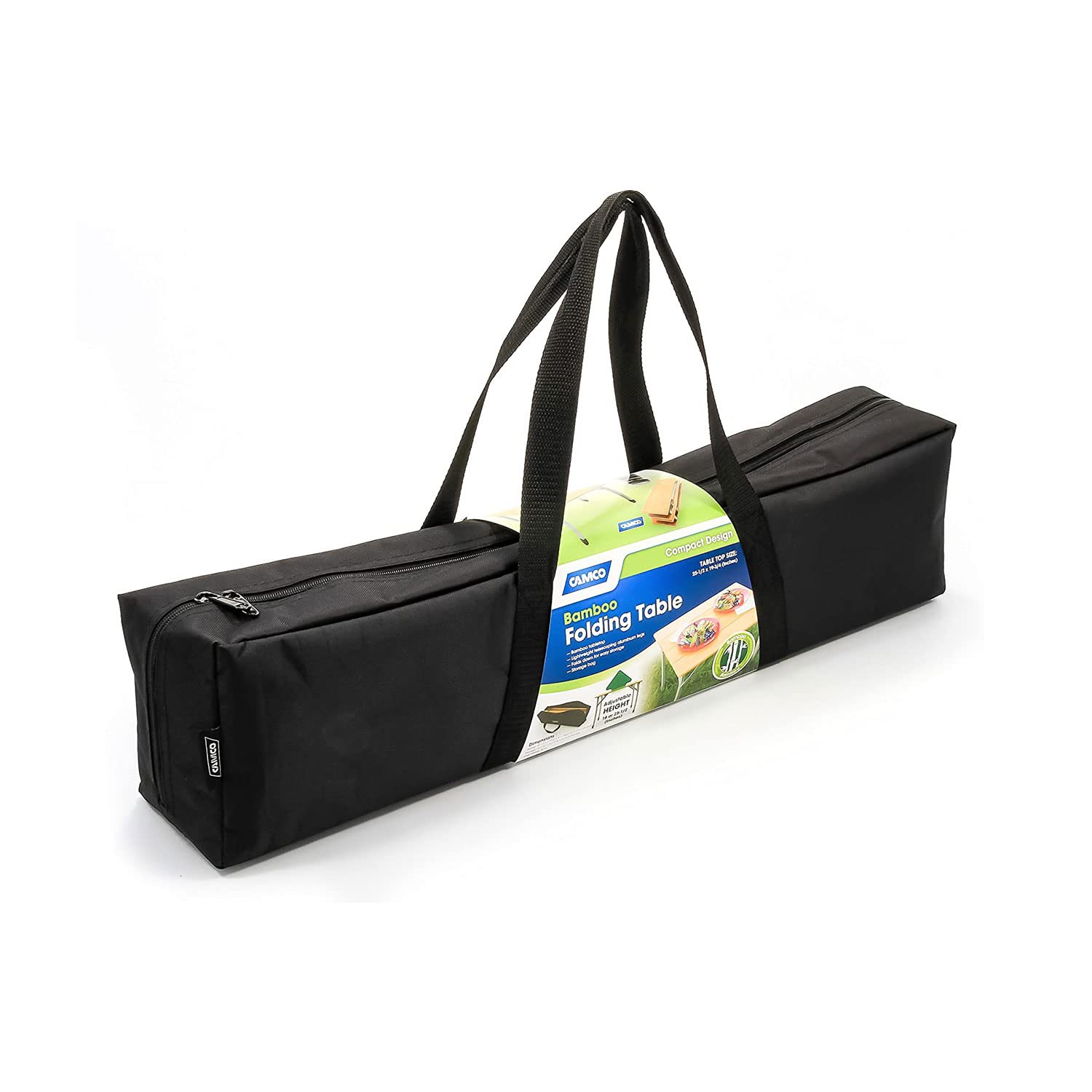Details: Camco’s Folding Bamboo Table Top provides a flat surface for eating and entertaining—great for picnics, tailgating and camping. It features an attractive natural bamboo top for an “at home” feel anywhere you go. The aluminum legs fold flat for transportation and storage. When in use, the legs telescope out to 18-inches or 25 ½-inches tall. Table folds and unfolds in seconds. Each leg clicks into place when fully extended and features an adjustable leveling knob foot. The included storage bag makes it easy to transport, and the overall design is lightweight for added portability. Folded dimensions are 26 ½-inches (L) x 4 ½-inches (W) x 6 ½-inches (H). Supports up to 85 lb. Camco makes quality products for RVing, boating, camping, towing, tailgating, and grilling that help you take your passion for the outdoors to the next level.