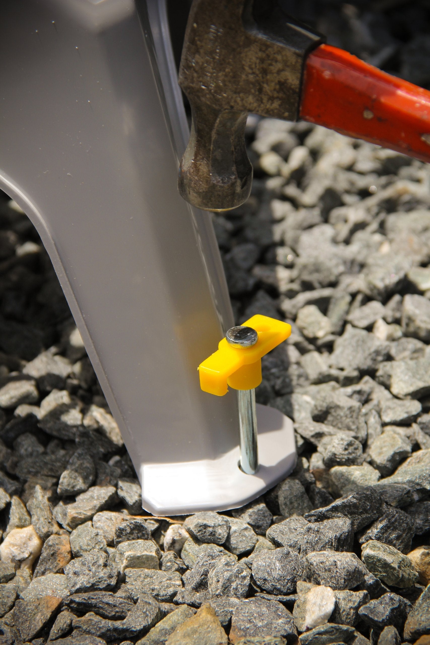 • Place stakes (SOLD SEPERATELY) into the holes at the base of the legs for added stability