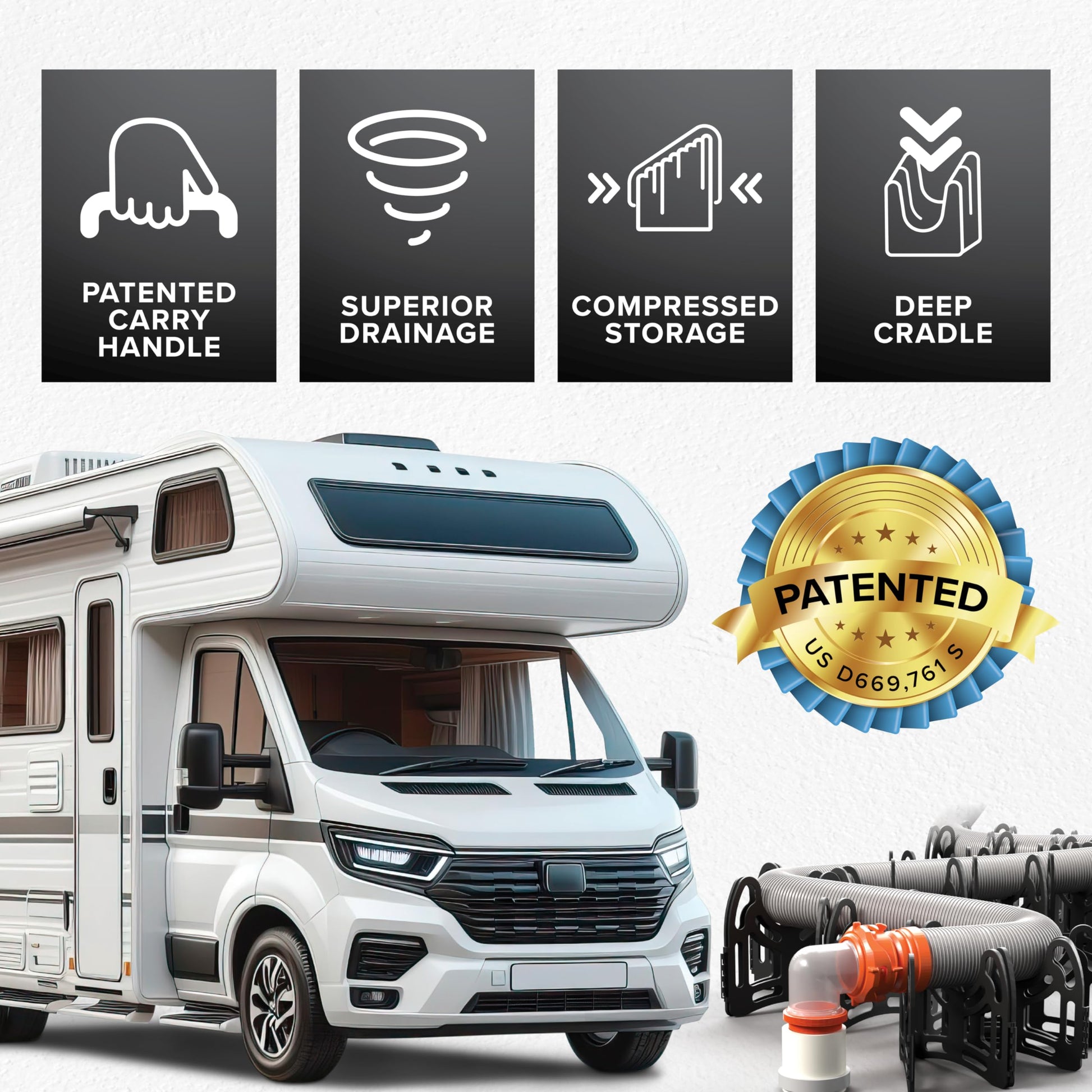 • Fits 15' Camper Sewer Hose: Say goodbye to hose slipping and closing issues. This innovative product securely holds a 15' RV sewer hose with a 3' diameter without slipping. Deep cradles keep your hose from creeping closed.