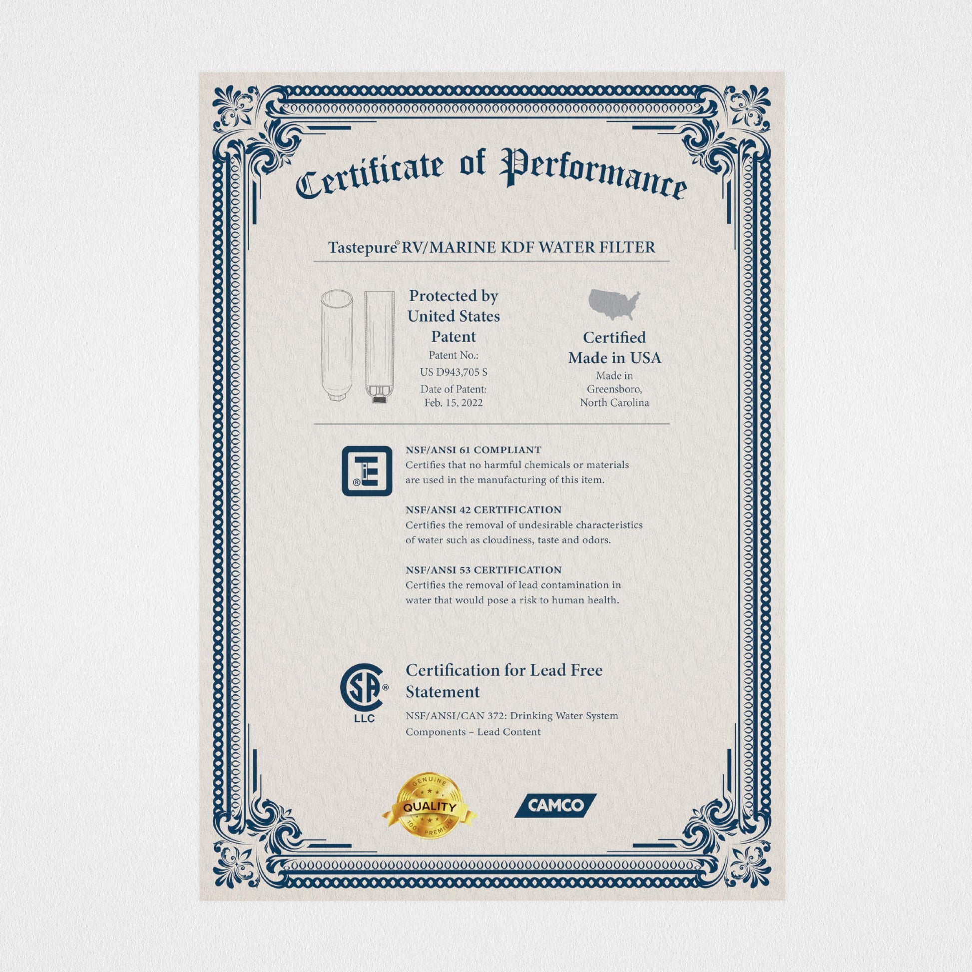 Details: Experience pure and clean water on your journeys with the Camco Tastepure RV Water Filter. This reliable American-made hose filter easily attaches to any water supply for clean drinking water wherever you go. The Tastepure RV water filter is a camper must-have! With its high water-flow design, you can stay hydrated without compromise. Say goodbye to kinks and strains with the included flexible hose protector. Rest assured, this RV water filter system exceeds industry standards and has undergone rigorous testing. Its certifications speak to its quality and reliability, making it a trusted choice for adventurers worldwide. Enhance your camping experience to the fullest! Upgrade to Camco's Tastepure Marine/RV Water Filter and discover the difference. Your thirst for adventure deserves nothing but the best.