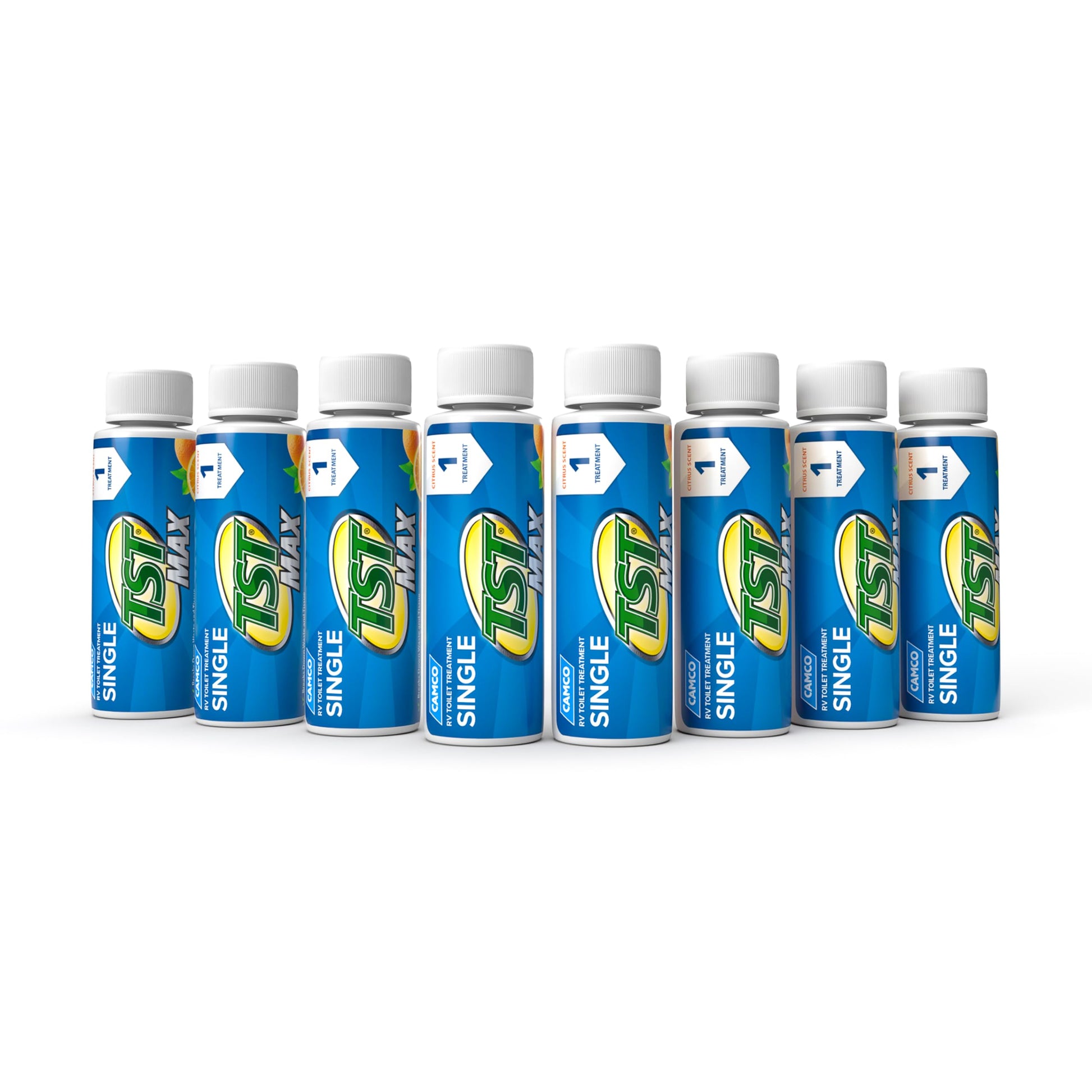 Camco TST MAX RV Toilet Treatment - Formaldehyde Free - Breaks Down Waste And Tissue - Septic Tank Safe - Treats up to 8-40 Gallon Holding Tanks -Orange Scent, (8) 4 oz Bottles (41191)