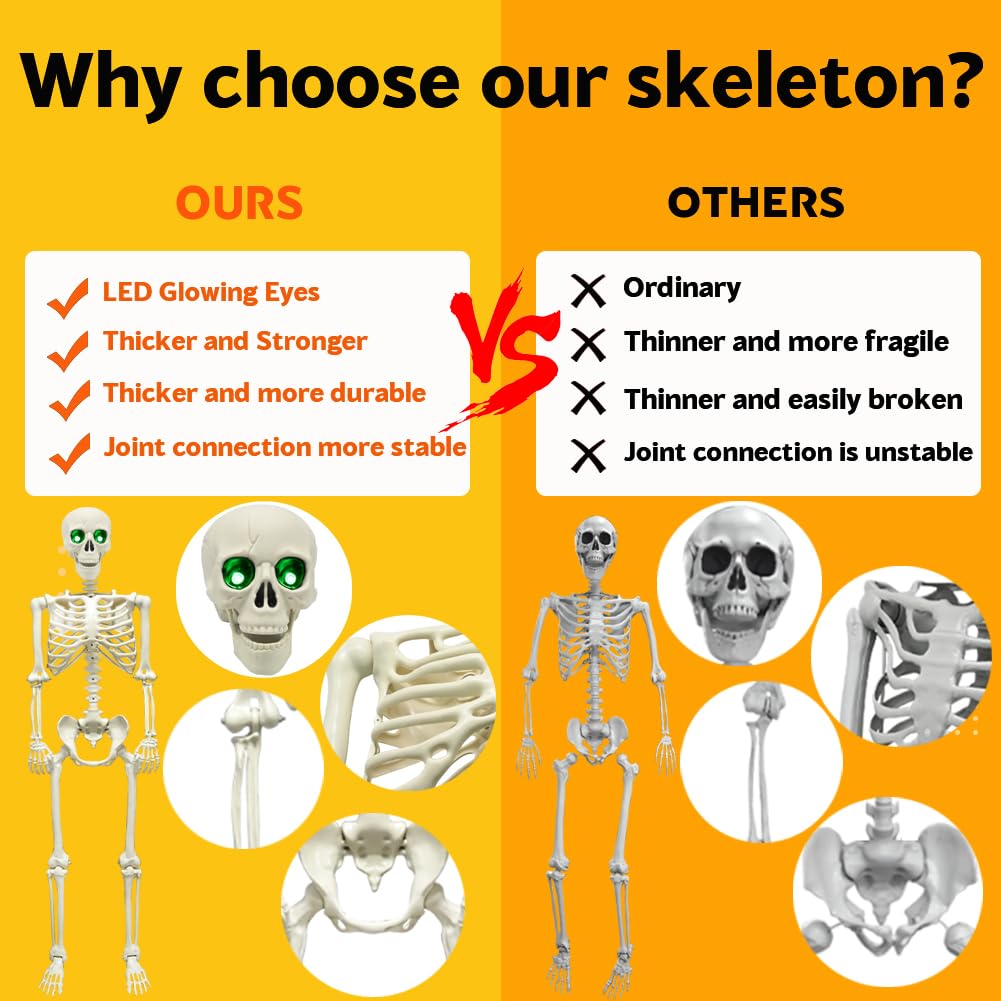 • 5.4FT Halloween Skeleton: Plastic skeleton comes with light and sound, and in the dark you can see red/green alternating glowing eyes and hear scary sounds!