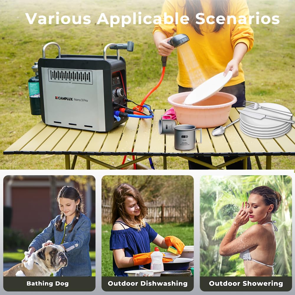 CAMPLUX Nano 3 Pro 1 lb Propane Portable Water Heater, Table Top Camp Water Heater & Shower Pump w/Built-in Battery, Compact Outdoor Camping Hot Showers