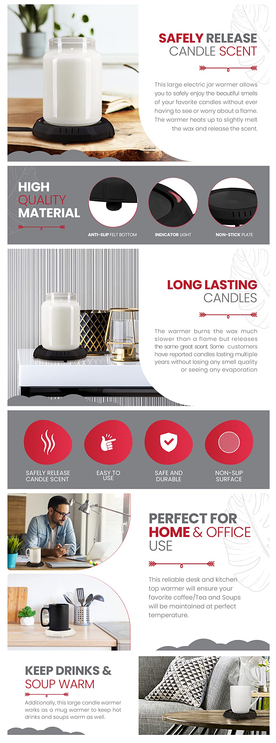 • HOME AND OFFICE USE: This reliable desk and kitchen top warmer will ensure your favorite coffee/Tea and Soups will be maintained at perfect temperature.