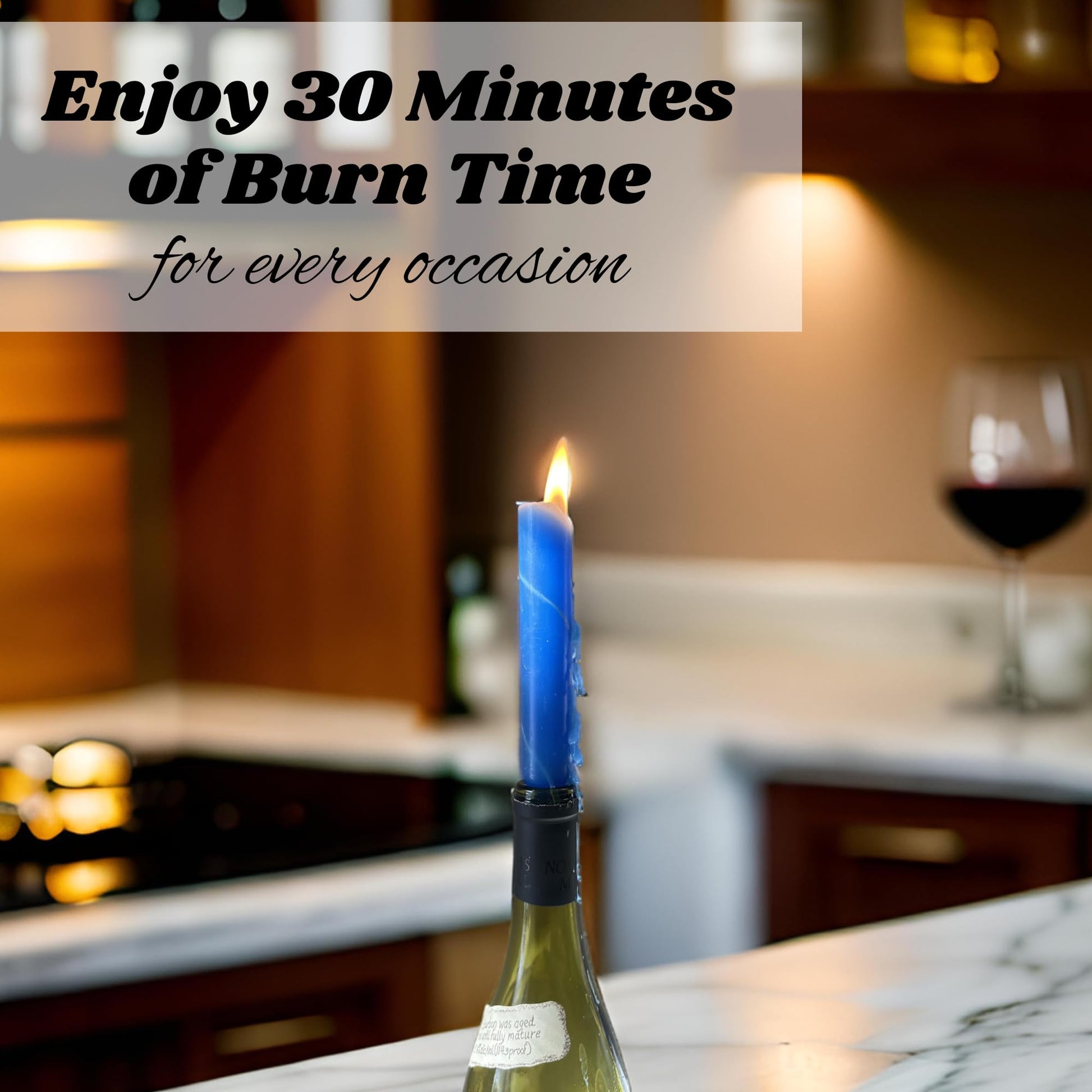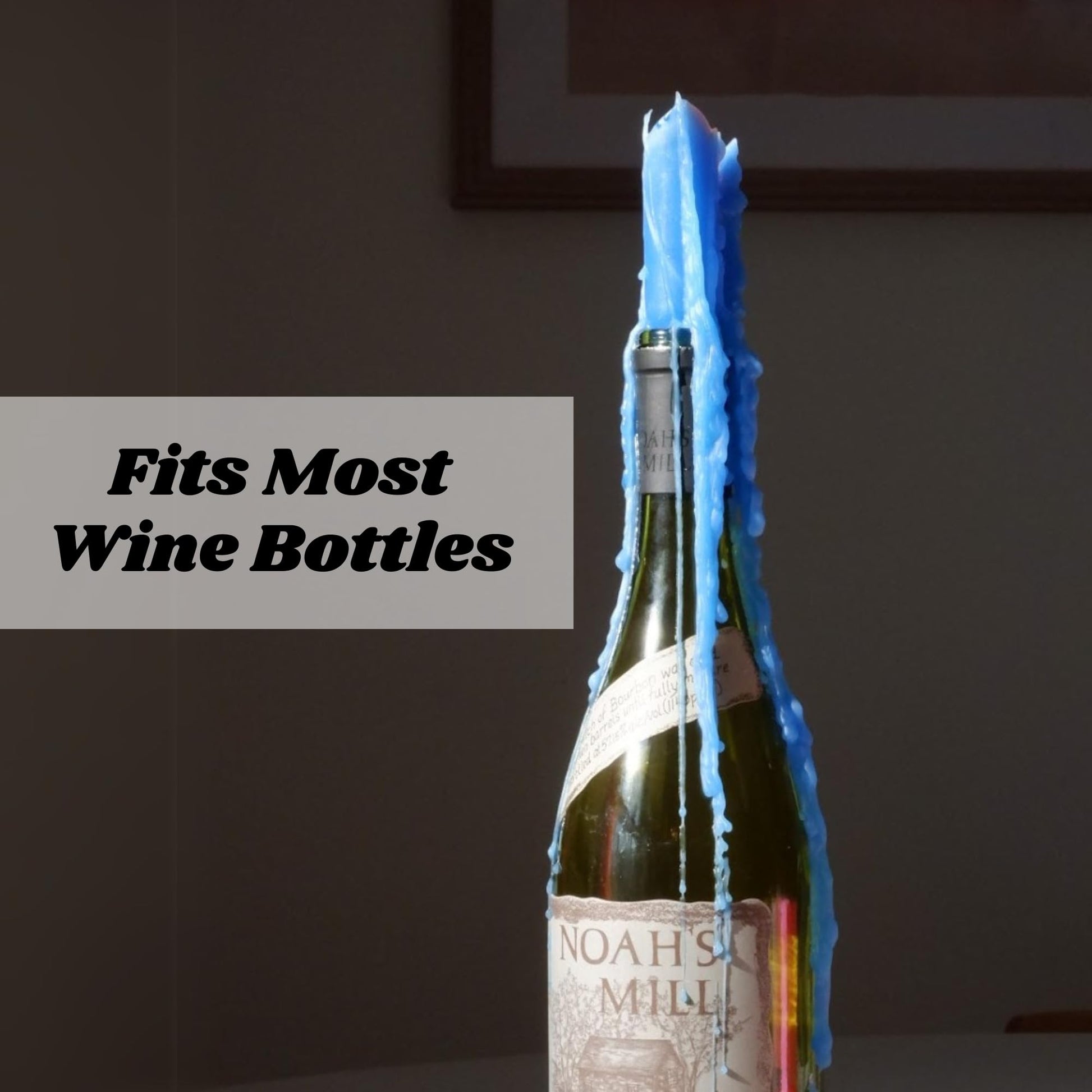• These drip candles are customized to fit perfectly in a wine bottle and come in an array of colors, including ivory, white, black, turquoise, pink, purple, blue, green, orange, yellow and red.