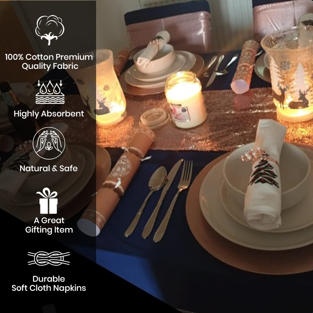 Candy Cottons Christmas Cloth Napkins White Dining Table Dinner Napkins|Washable Cotton Napkins Easter Basket Decor|Christmas Tree Embroidered 18x18 in White Pk of 6 Cocktail Party Napkins