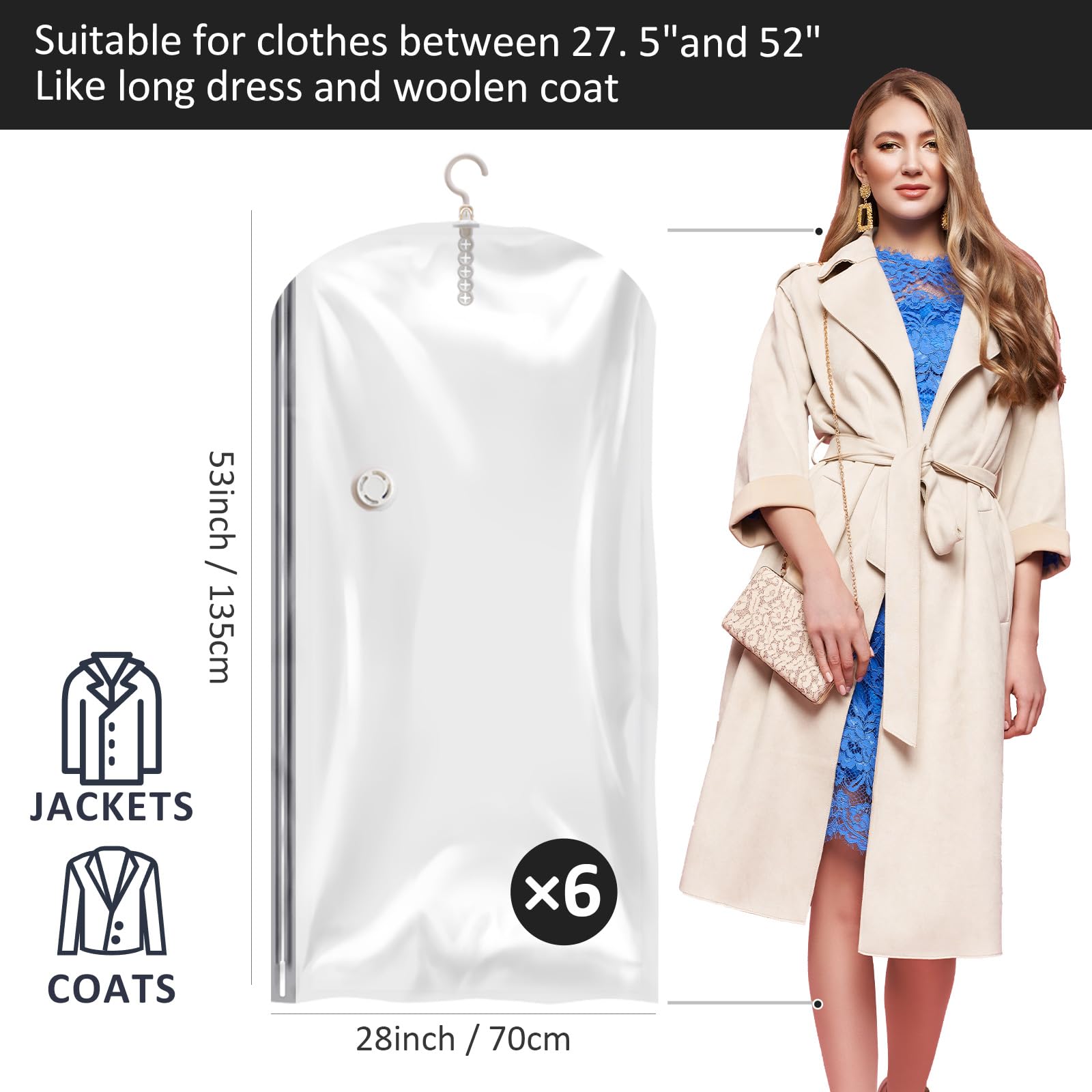 Hanging Vacuum Storage Bags, 6 Pack Large Hanging Vacuum Seal Bags for Clothing, Space Saver for Clothes, Suits, Dress, Jackets, Closet Organizer for Moving Supplies(53.1x27.6 in)