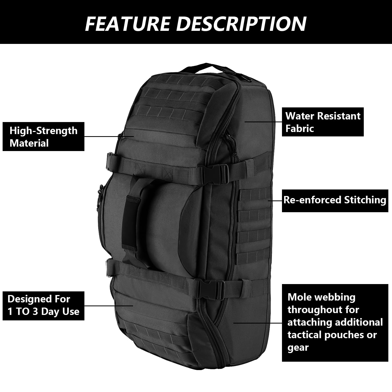 • 3-in-1 LARGE CAPACITY - Large duffle bag size approx.: 26.7'*13'*9.8' / 68*33*25CM (L*W*H) . Capacity:65L. This tactical military assault backpack is made of quality and water-resistant high density fabric. With large capacity allow you to carry all your tactical gears, it can be used as Travel duffle bag, Gym duffle bag, Utility duffle bag and so on.