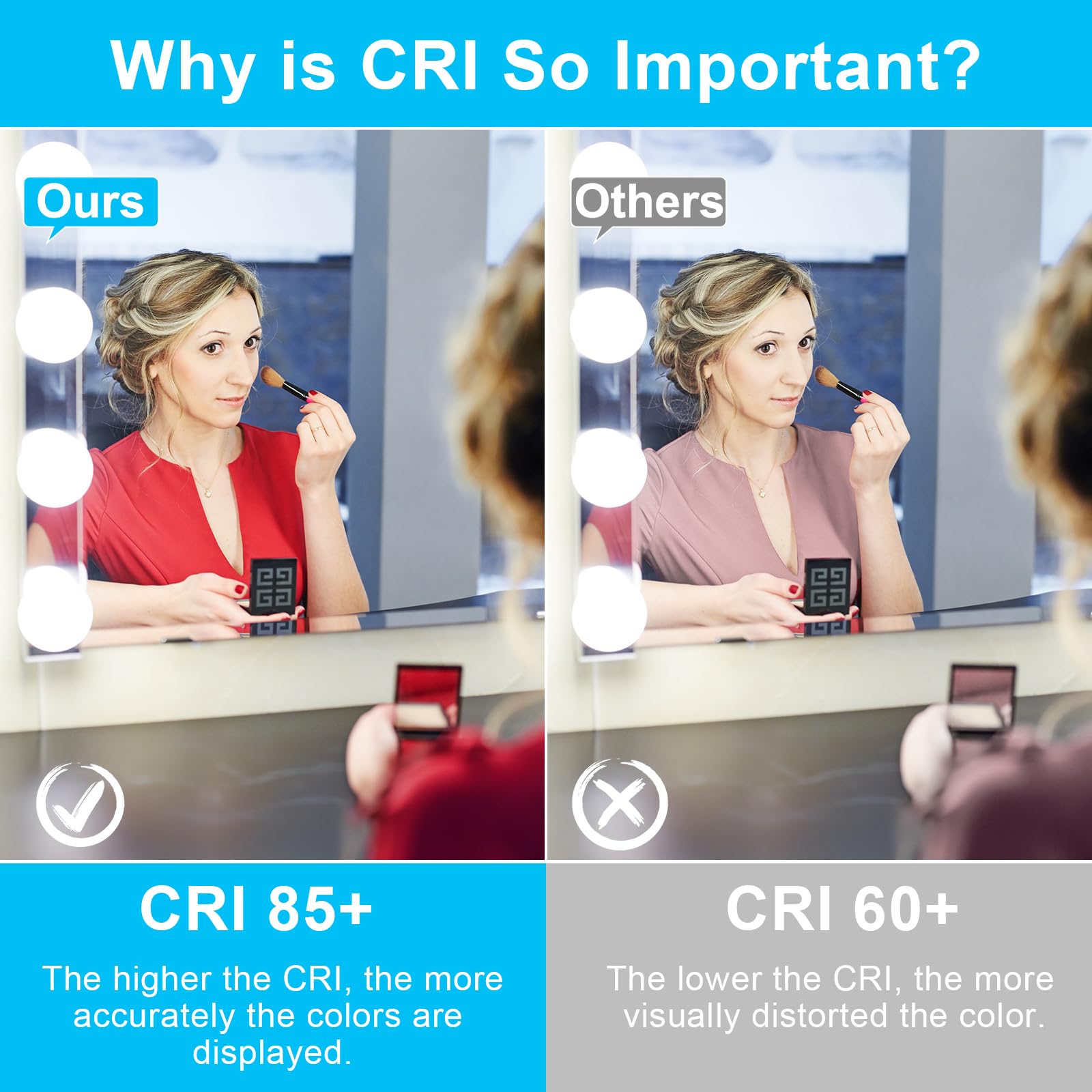 • Vanity Light Bulbs With 85+ Cri: The Color Rendering Index (CRI) is a simple and helpful lighting spec to predict how good the visual output of a lighting product is. The closer to 100, the better or truer colors should look under its light. 85+ CRI means that the G25 LED globe light bulb can reflect the original color of the object, and provides the most accurate reflection of your face for better makeup.