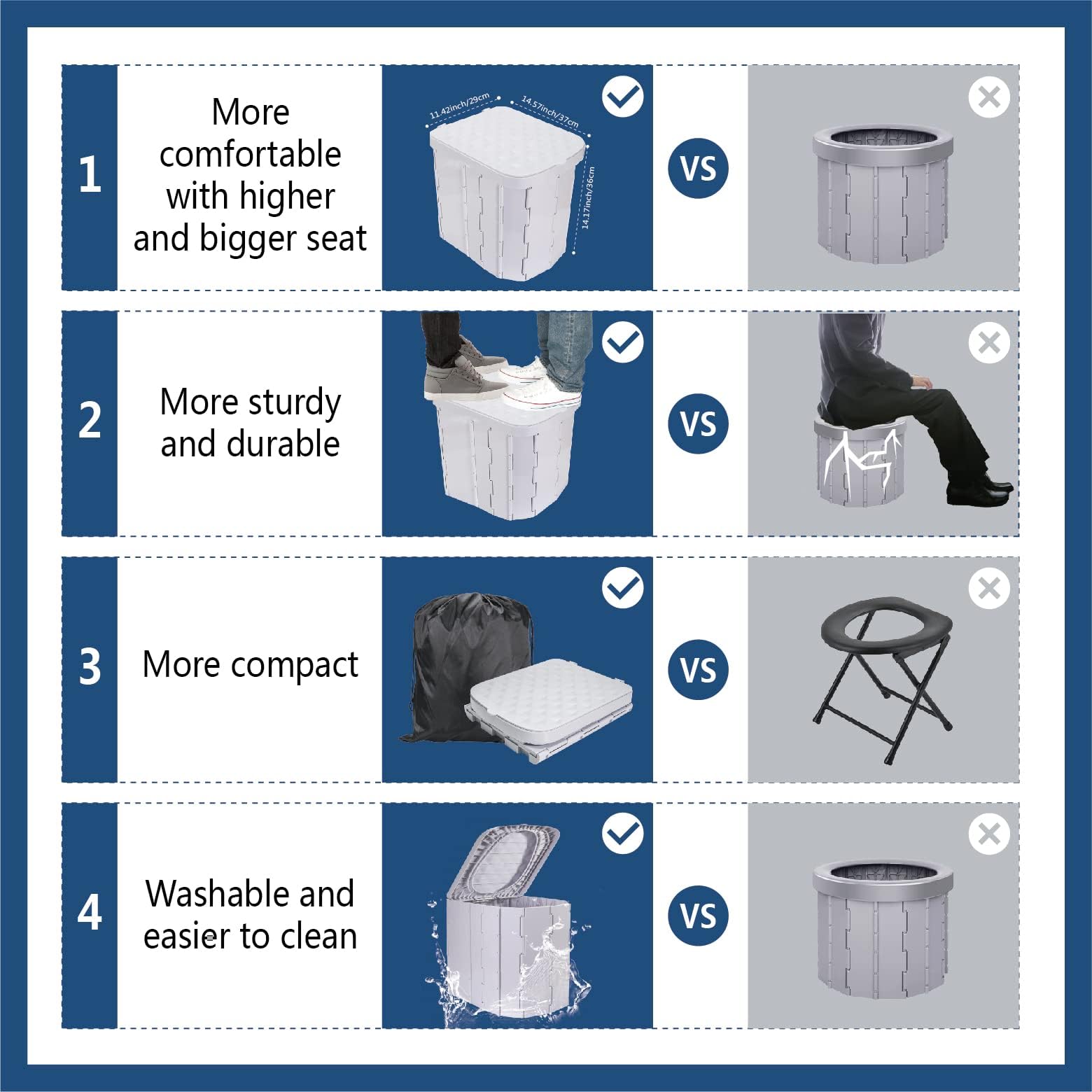 • 【Extra Large and More Comfortable】The size of Hapoon portable toilet is 14.57'L*11.32'W*14.17'H, It is more comfortable with a higher and wider seat compared with most of other portable toilets in the market.
