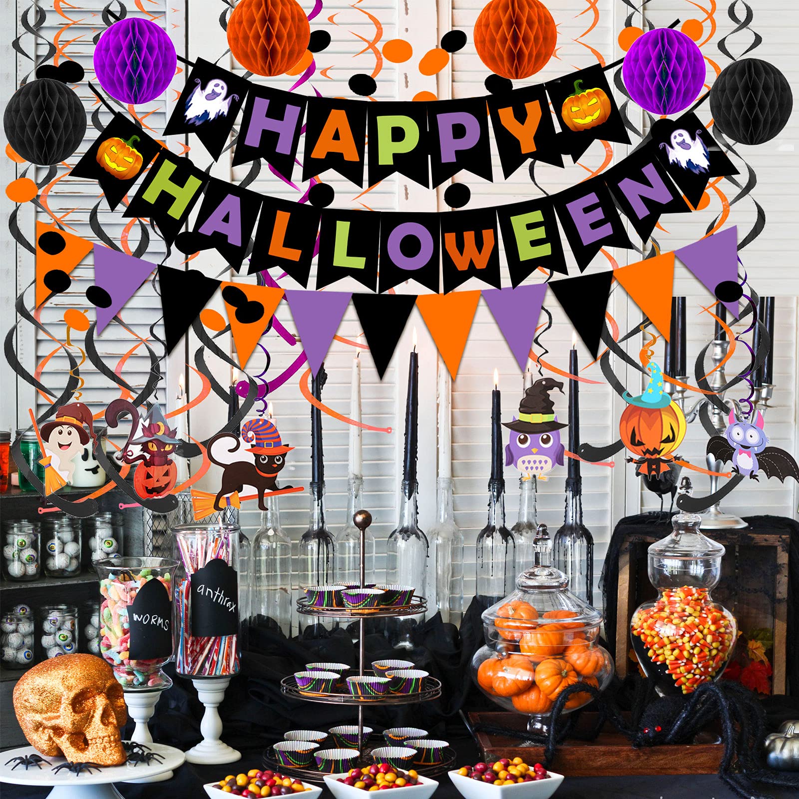 • The cute halloween Paper Triangle Flag Banner Confetti Circle Garland Honeycomb Ball Swirl Streamers perfect for your halloween Happy Birthday /thanks giving DAY /Baby Shower/ kids birthday etc...Party Decorations.High quality Brand items from FECEDY!
