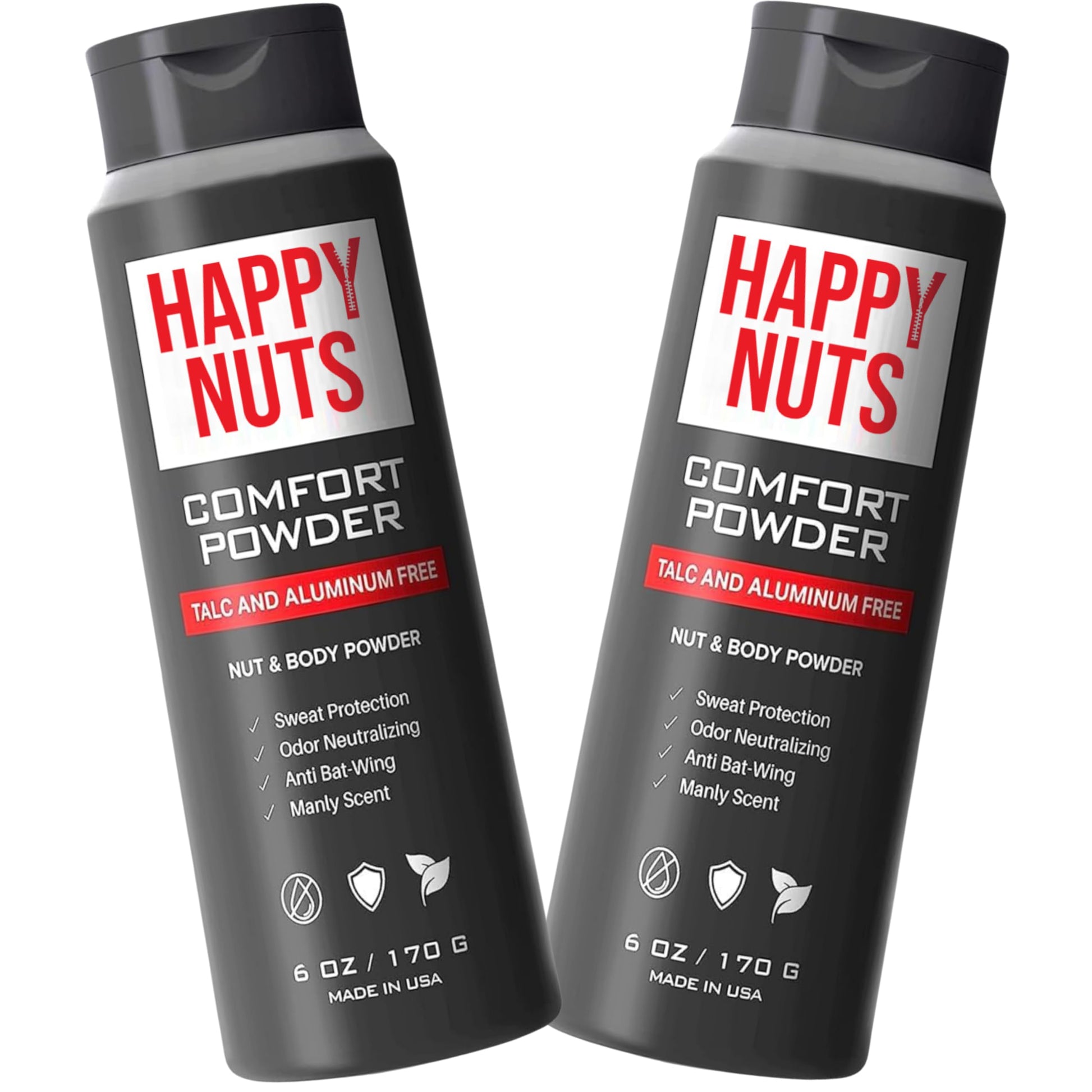 Details: Happy Nuts Comfort Powder for men is made in the USA. It's a talc-free plant-based nut and body powder that provides all-day comfort with protection against sweat, chafing, and odor. It can be used for as a chaffing balm for your groin, feet, and any area of the body that experiences wetness or chafing