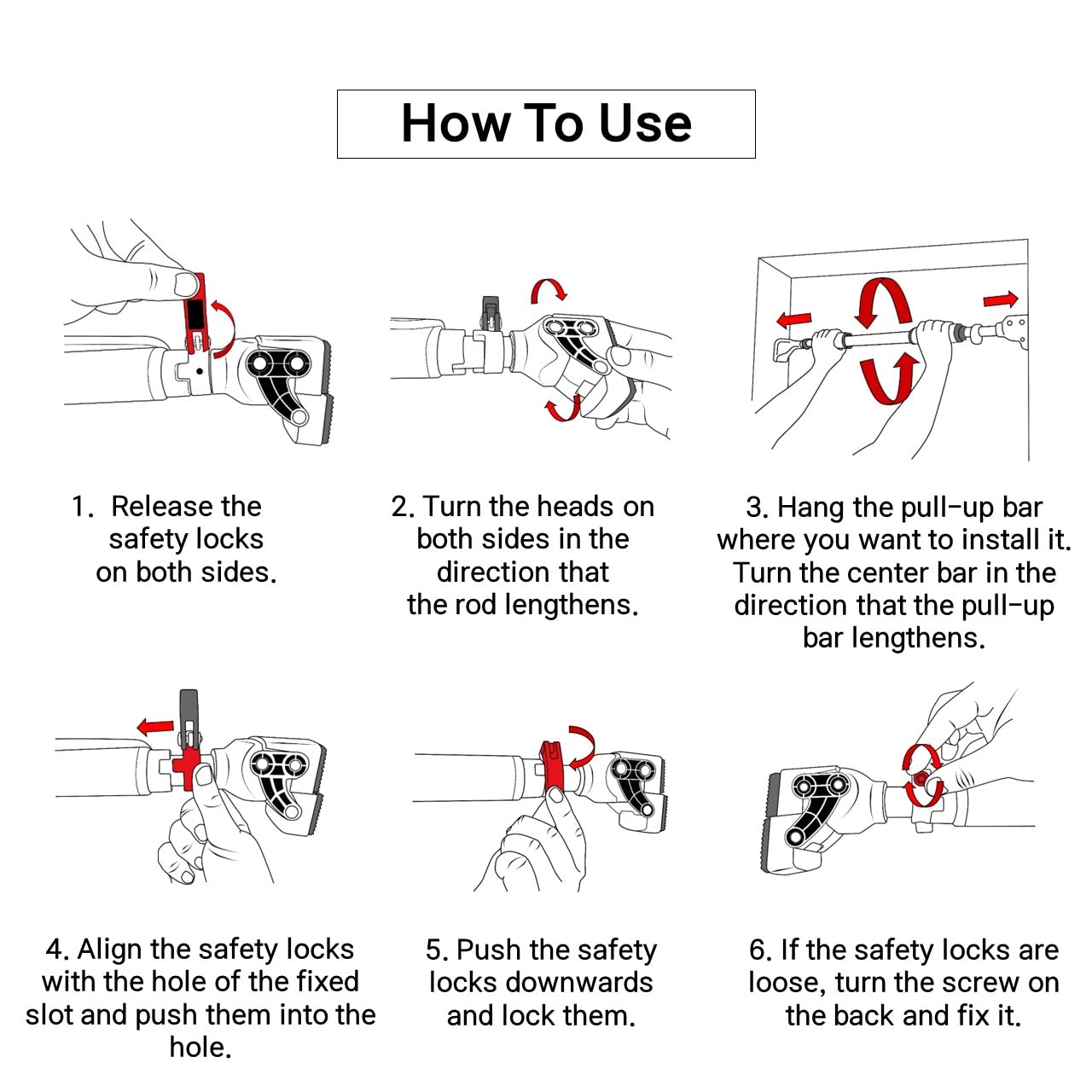 • 1. 【Fixed without Screw/Hole on the Doorway】 - Minimize door damage with pressure distribution mechanism. If there is the right wall space, you can install this pull up bar anywhere without door frame damage.
