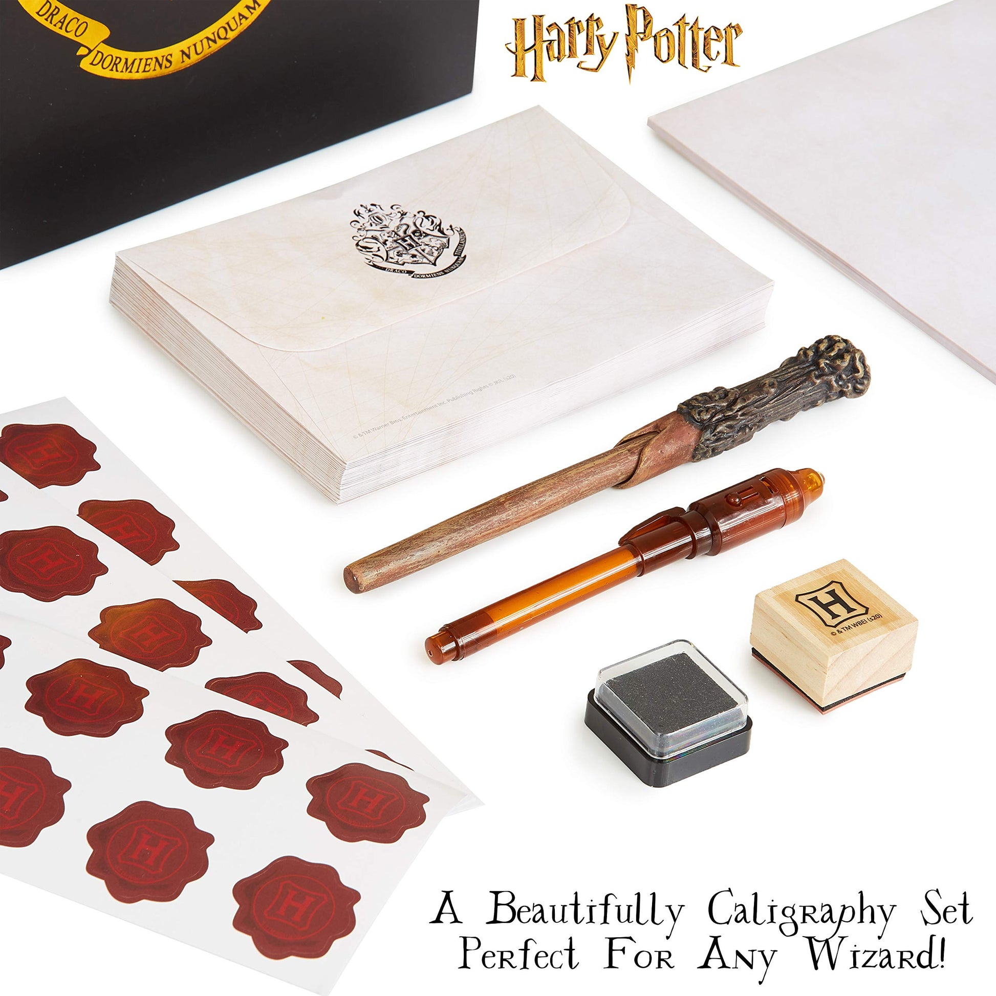 Harry Potter Calligraphy Set with Notepad Wand Pen Magic Invisible Ink Pen Envelopes Paper Cool Stickers Ink Stamp Fun Hogwarts Stationary Gift for Kids