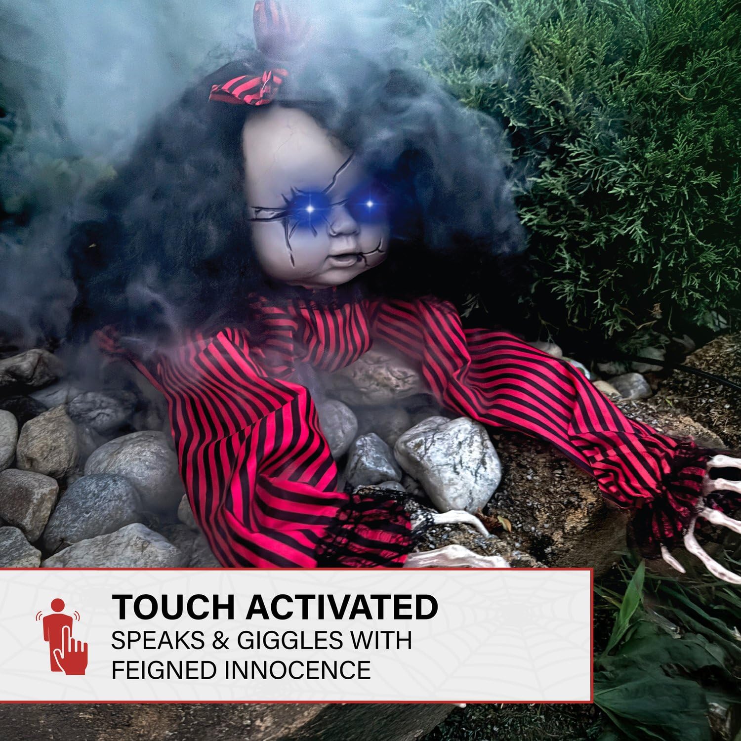 Haunted Hill Farm Scary Haunted Crawling Baby Doll, Halloween Animatronic with Touch Activated Lights and Sound, Battery Operated Indoor or Covered Outdoor Halloween Decorations, Creepy Fright Props