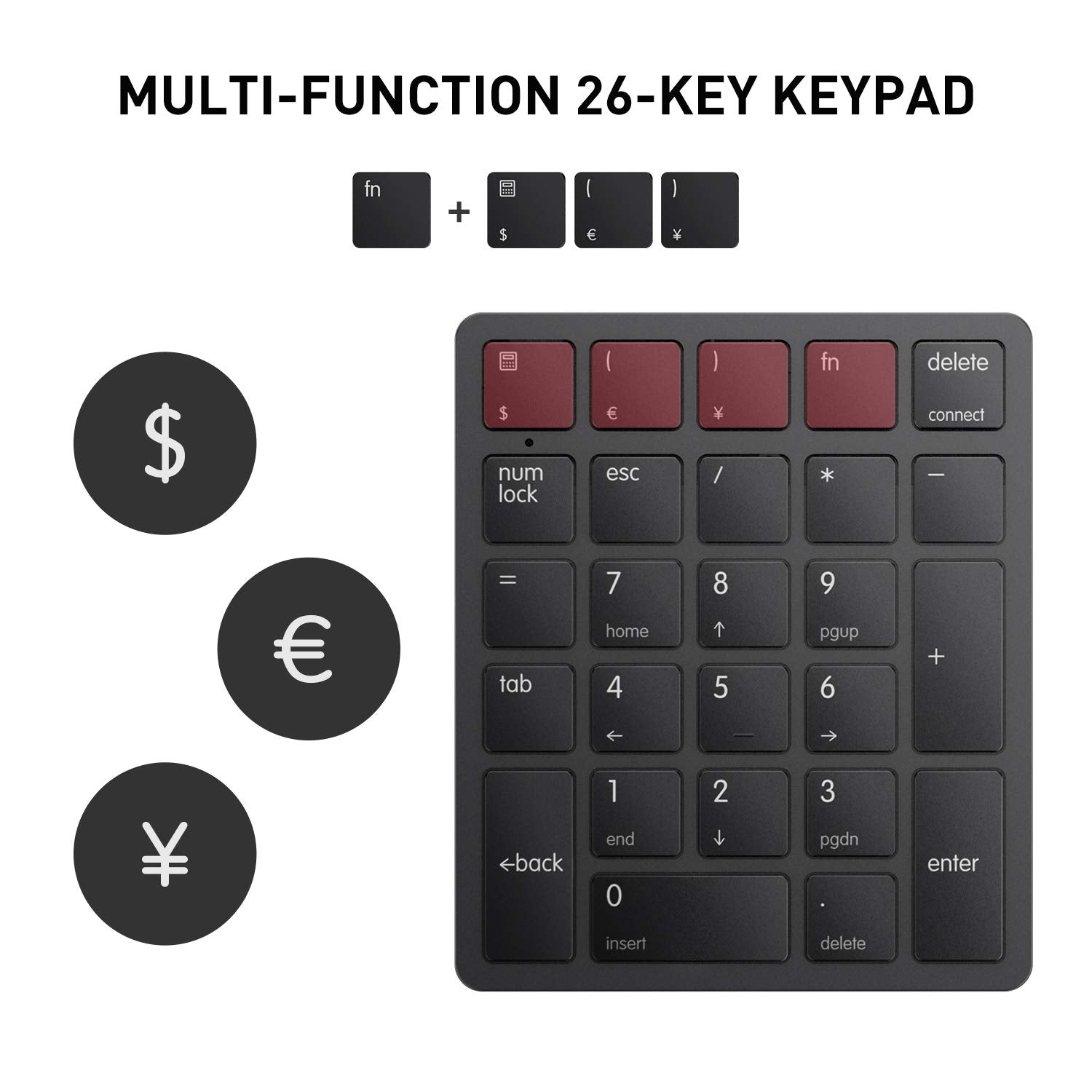 • Multi-function 26-key Keypad: With NumLock, ESC, Delete and a shortcut key which can open the computer calculator directly etc.The number keyboard is more unique in that it can be combined into 3 currency symbols through Fn+composite keys