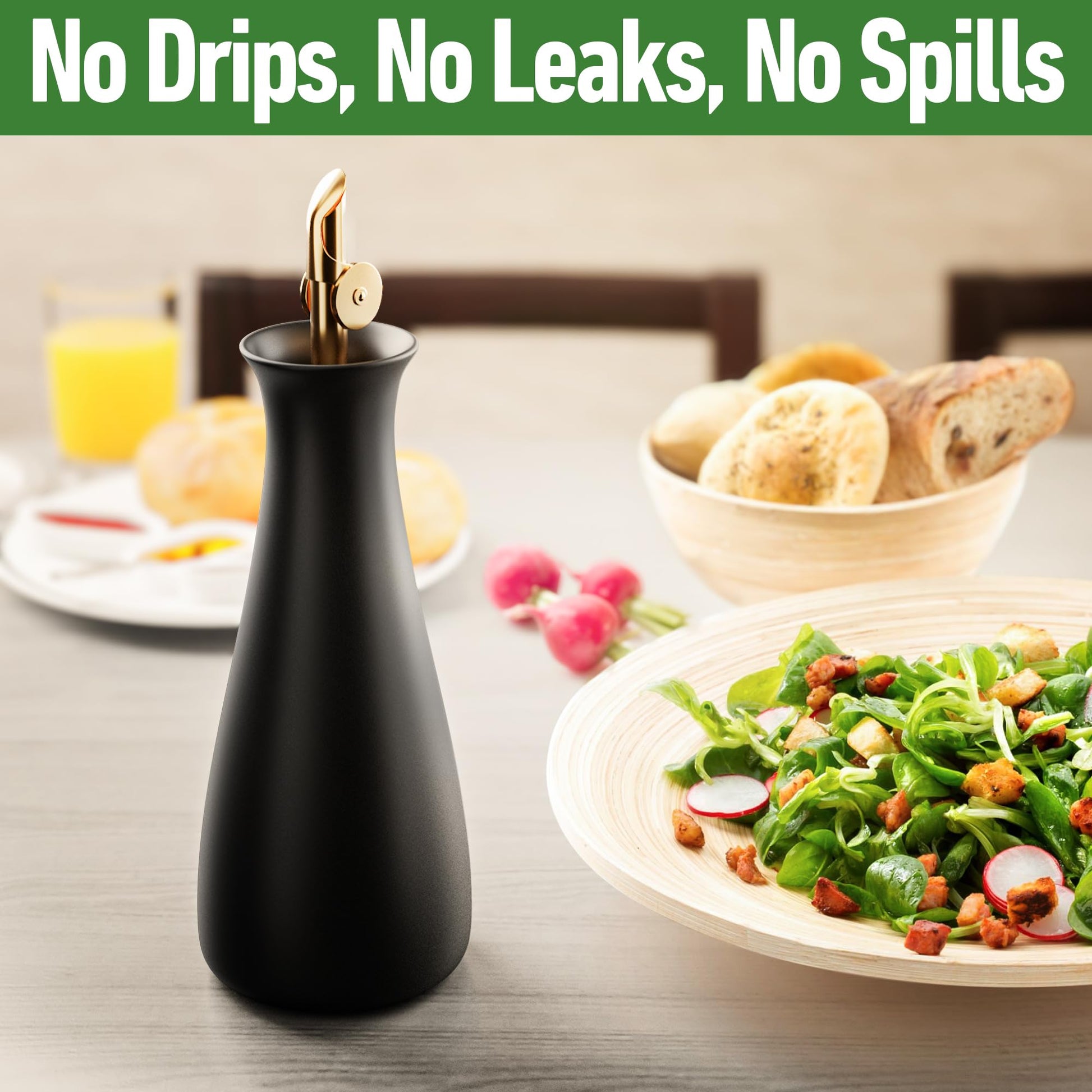 • SELF-CLOSING GOLD SPOUT - This leak proof oil dispenser has a snug fit stainless steel nozzle that opens and closes itself whilst giving the perfectly smooth pour with no leaking or dripping. To protect the beautiful gold spout, we do not recommend using vinegar with this no drip oil dispenser.