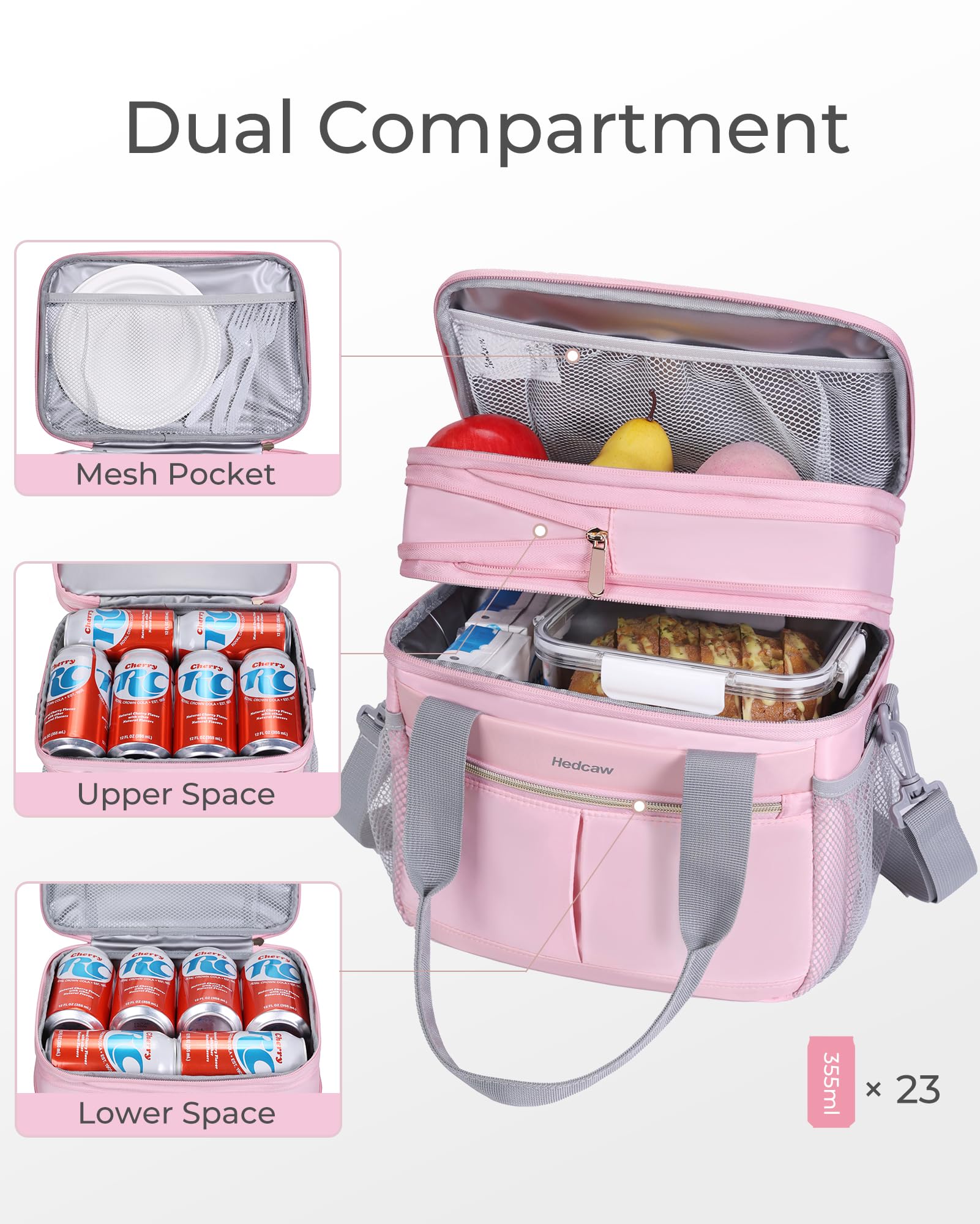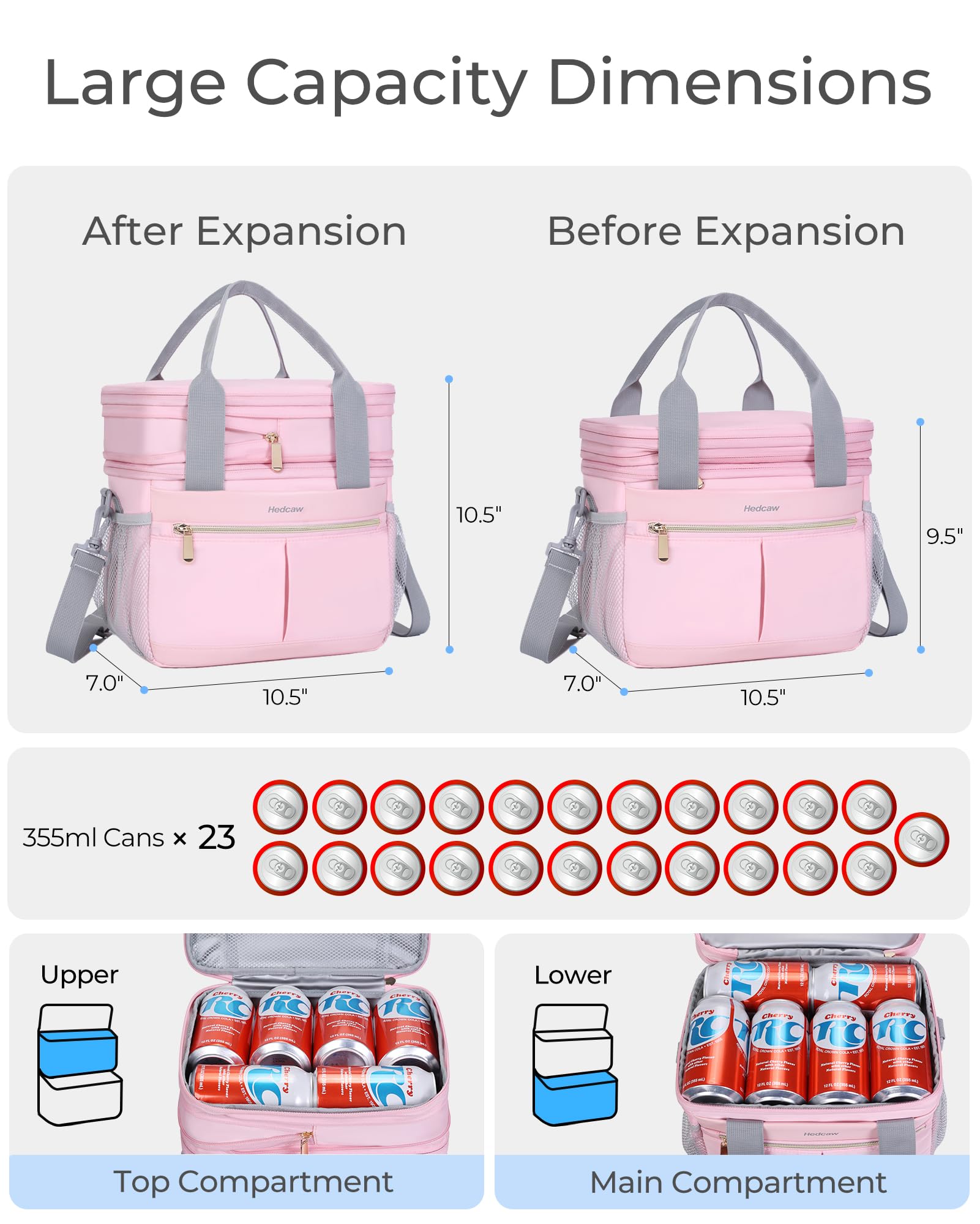 • Large Capacity: Original size: 10.5' × 7.0' × 9.5' inch (L×W×H). Expanded size: 10.5' × 7.0' × 10.5' inch (L×W×H). After expansion, it can fit up to 23 can bottles of 355ml drinks. Different foods can be placed on the upper and lower layers to prevent food from being piled up and squeezed. The lower main compartment can be used to store beer, drinks and lunch containers. The upper layer can be used to store snacks, fruits, bread, etc.