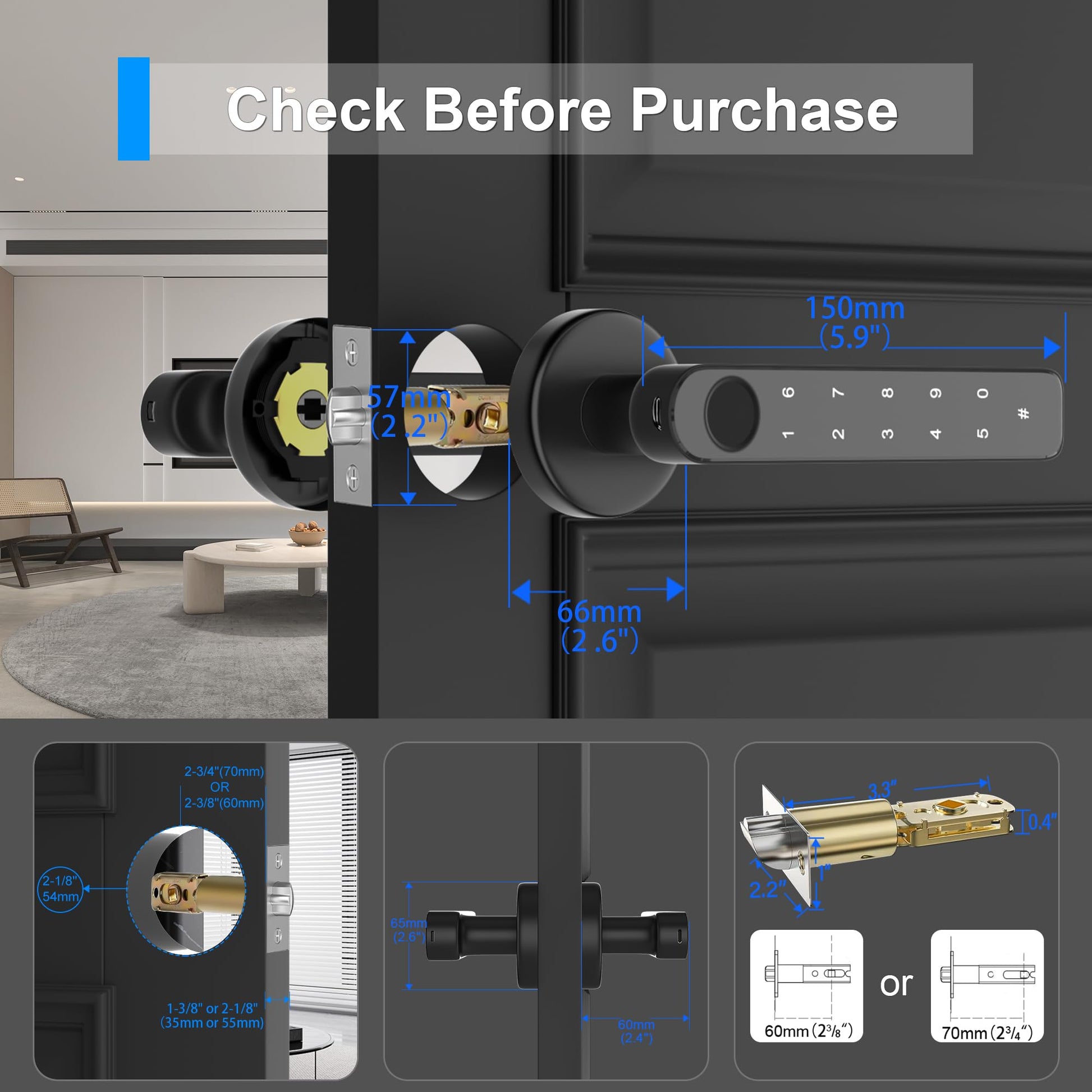 • Smart App Control:Fingerprint door knob Unlock at any time via Bluetooth application. View access records and effortlessly share permanent, temporary, or scheduled access with friends and family. No more hiding keys under the doormat.