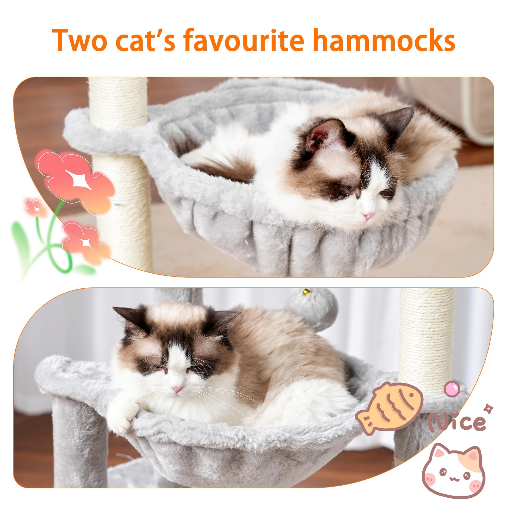 • A Safe Haven for Cats to Play and Rest: Our cat trees for indoor cats have both a cozy cat condo and round hammocks, designed to provide your cat with the privacy and comfort they need for their daily nap or playtime. The dangling balls with bells also help to pique your cat's curiosity, giving them extra stimulation and entertainment.