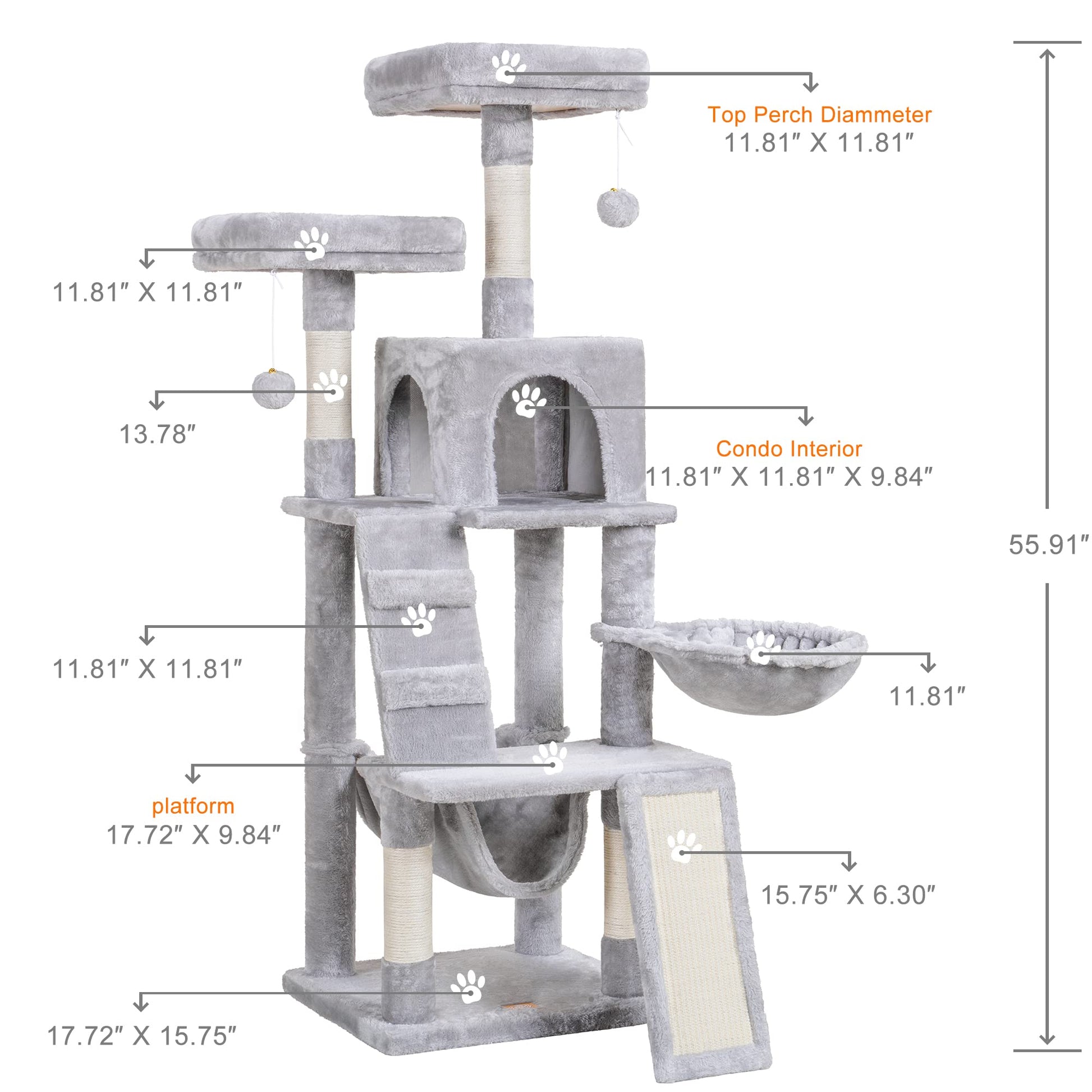 • Ideal design of structure: Structure of the cat tree is designed according the climbing habits of cats. A springboard is added to help any age range cats to climb up and down.